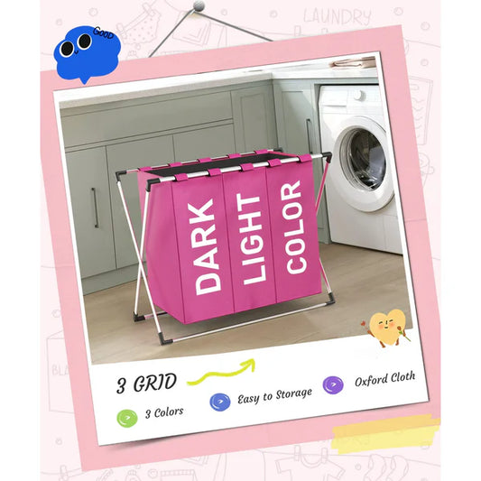 Riousery Laundry Basket Clothes Hamper Sorter 3 Section, 135 L Storage Collapsible X Frame, Pink