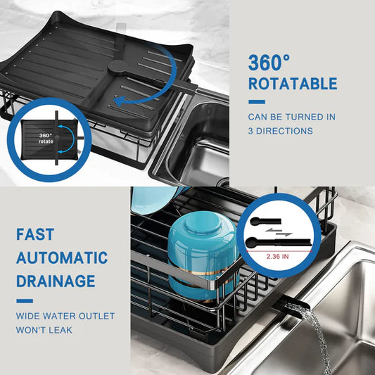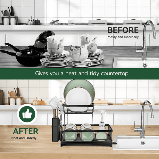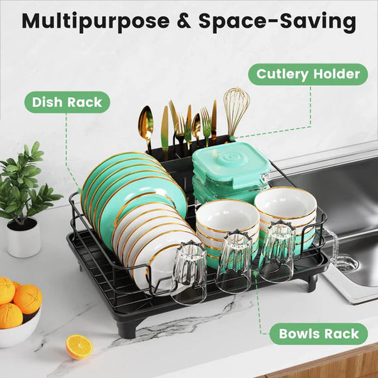 Riousery Dish Drying Rack for Kitchen Counter, Compact Dish Rack Drain Set with Utensil Holder,Cup Holder,Black