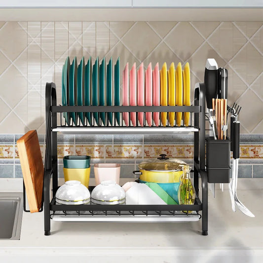 Riousery 2 Tier Dish Racks for Kitchen Counter, Dish Drying Rack with Dish Drainer, Durable Stainless Steel Dish Rack Drain Set with Utensil Holder, Cutting Board Holder, Kitchen Dishes Organizers