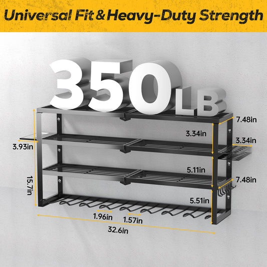 Riousery Heavy Duty Power Tool Organizer Wall Mount, 8 Drill Holder Rack with Hooks, 4-Tier Tool Storage Shelf with 350Lbs Load Capacity, Garage Tool Rack for Workshop Shed Pegboard Wall