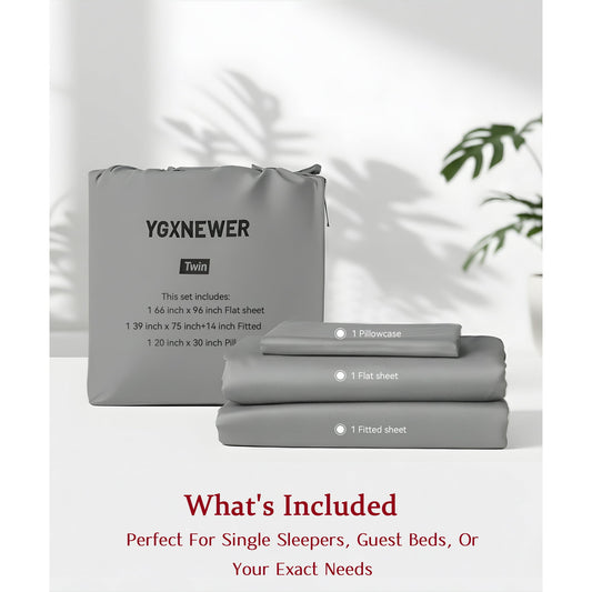 YGXNEWER 3 Pcs Twin Bed Sheet Comfort Set, Soft Breathable Microfiber Sheets, for 14" Deep Mattresses, Pillowcases, Flat Sheet, Fitted Sheet, Gray