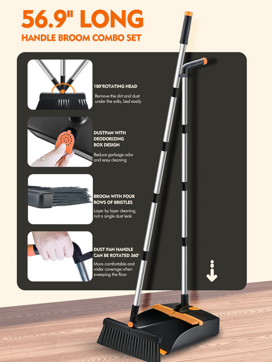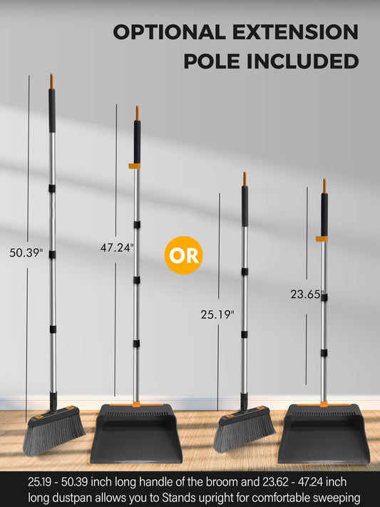 BIMZUC Broom and Dustpan set with 50.4" Long Handle Extension Pole Set for Home (Black+Orange)