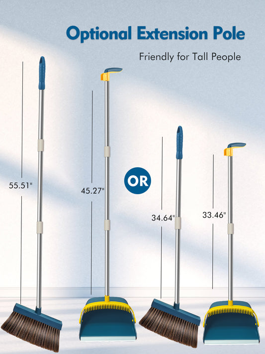 BIMZUC Upgrade Broom and Dustpan Set for Home,Self-Cleaning with Dustpan Teeth,51.2in,Stand Up,Blue