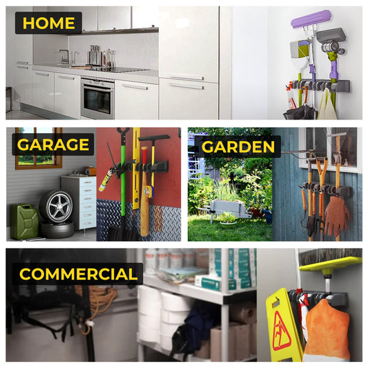BIMZUC Wall Mount Broom Holder, 5-Position Plastic Organizer with Hooks, for Home and Garden Cleaning Tools