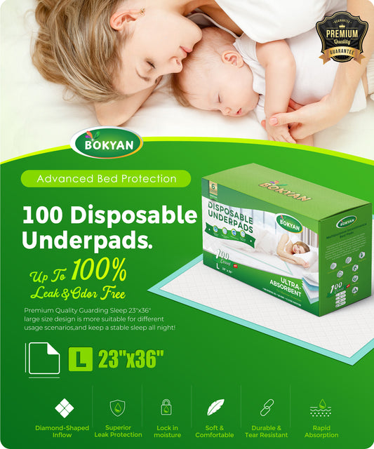 BOKYAN Disposable Underpads 23 x 36, 100 Count Bed Pads for Incontinence Unisex Large Maximum Absorbency Underpad
