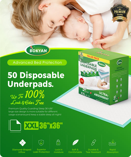 BOKYAN Bed Pads for Incontinence Disposable, 36 x 36 Waterproof Underpads, Maximum Absorbent Unisex Large Chucks Pad, Bed Liners Chux for Adults, Kids and Pets, XXL (50 Count)