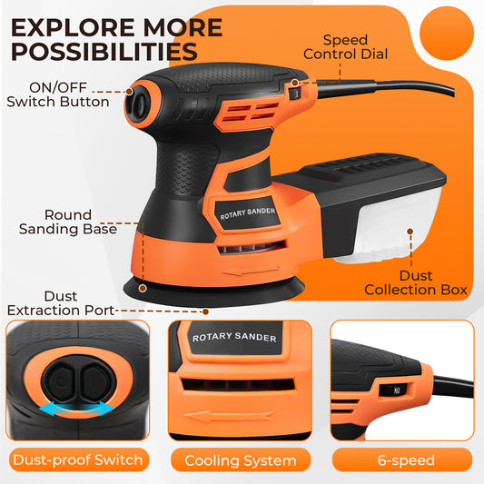 HOTREE Electric Random Orbital Sander, 6 Speed Adjustable Sander for Woodworking, Polishing and Sanding, with Dust Collection System