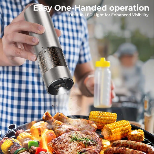 M Buder Electric Salt and Pepper Grinder Set, Automatic Battery Pepper Mill Shakers Adjustable Coarseness Easy Filling with Led, 2 Pack, Silver