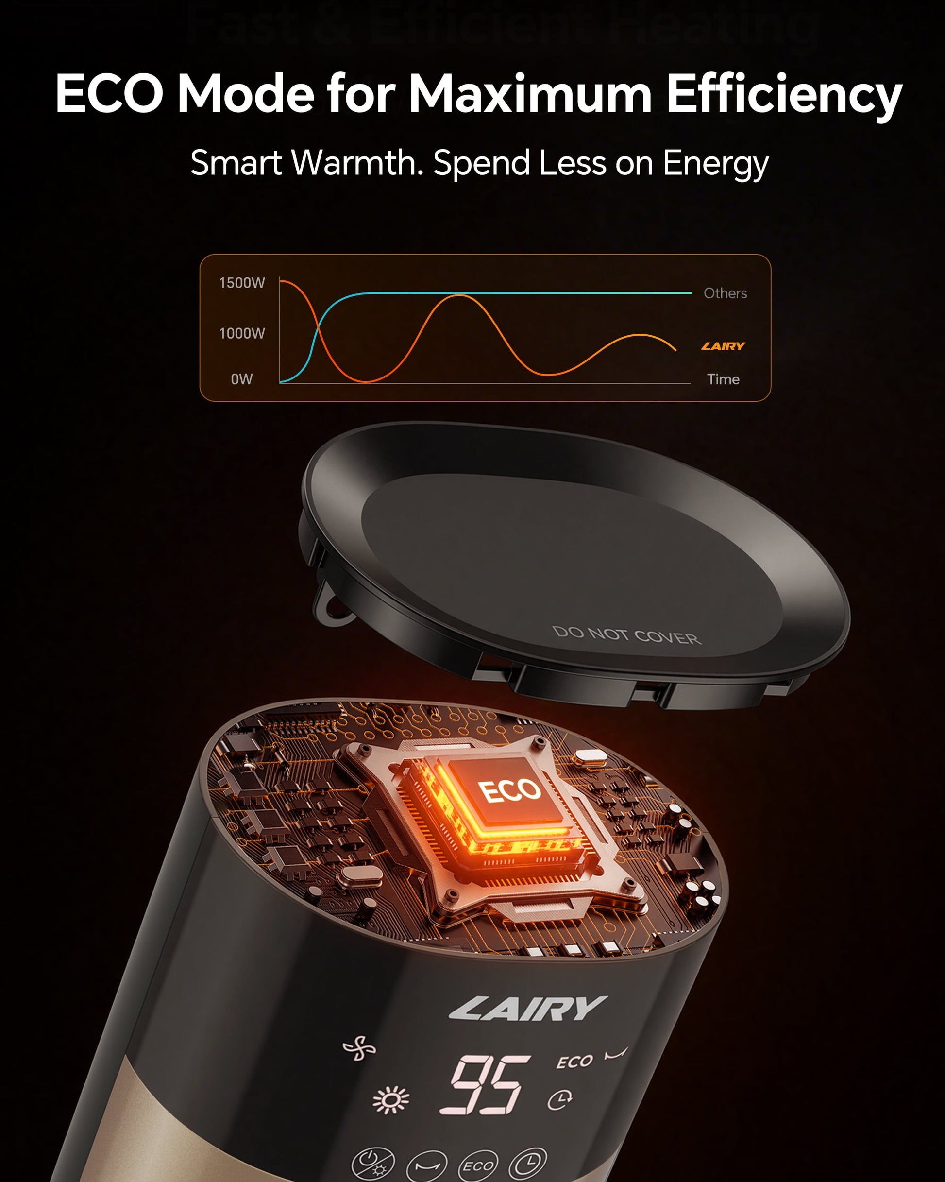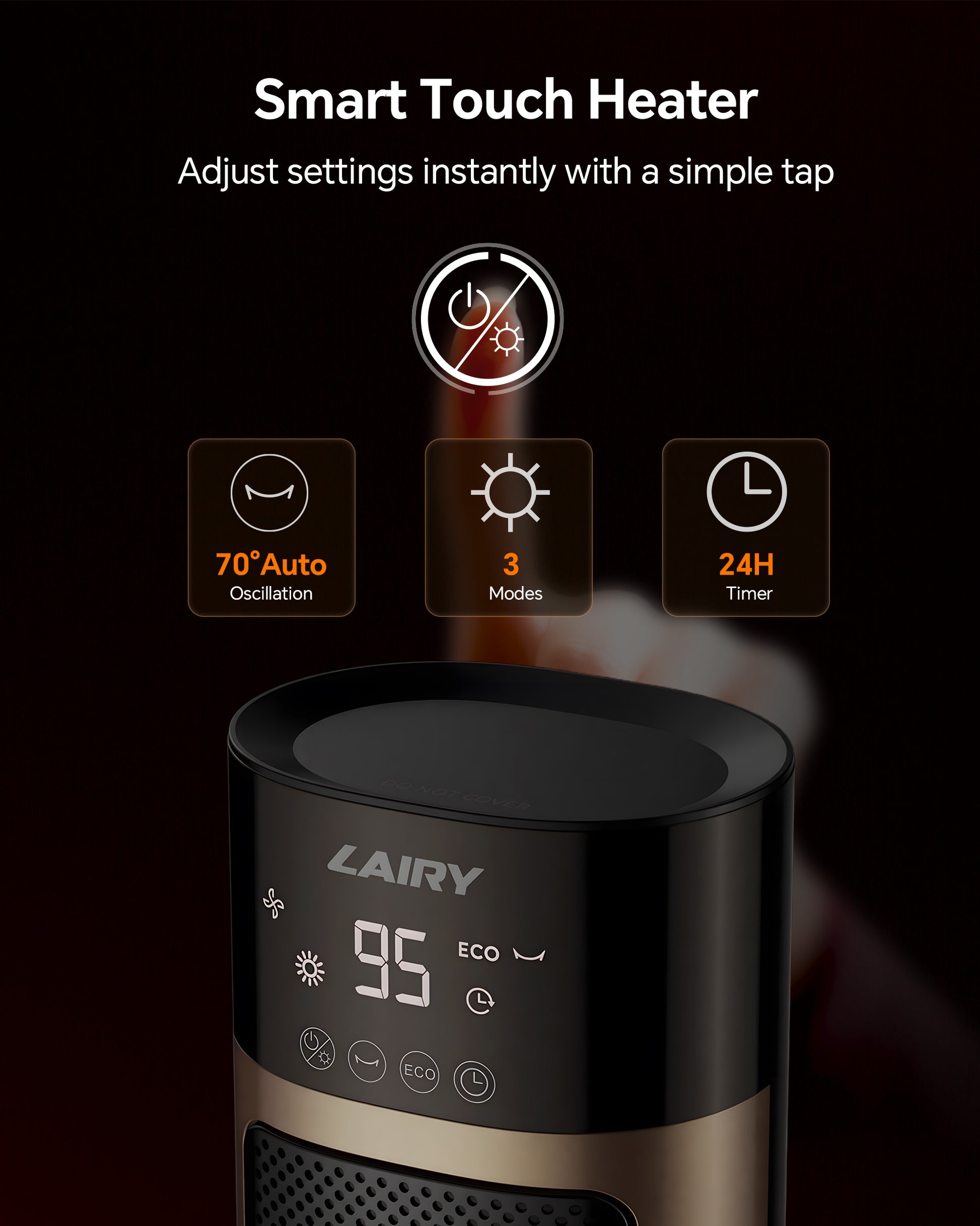 Experience powerful and efficient heating with the 24-inch Ceramic Tower Heater, designed to quickly warm rooms up to 270 sq. ft. using advanced PTC ceramic elements and wide 70° oscillation for full-room coverage. The built-in ECO mode intelligently maintains your preferred temperature between 60–95°F by adjusting output based on room conditions—saving energy without sacrificing comfort. Easily control your settings using the intuitive top touch panel or the included remote, and enjoy added convenience with a 12-hour timer for auto shut-off or preheating. With four versatile modes—High (L2), Low (L1), Fan, and ECO—this space heater adapts to your needs throughout the seasons. Engineered for ultra-quiet operation, it creates a warm, peaceful environment ideal for bedrooms, home offices, and living rooms.