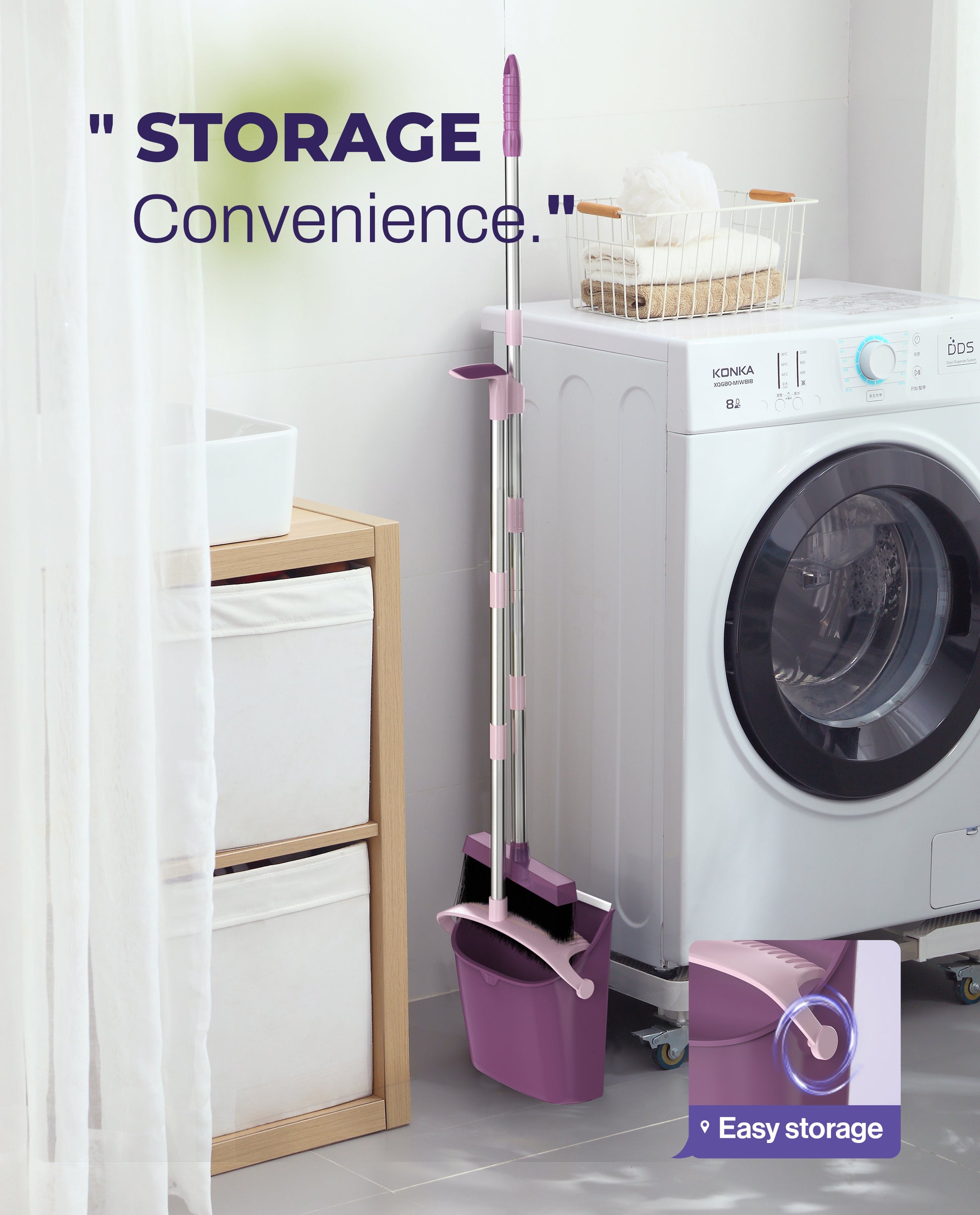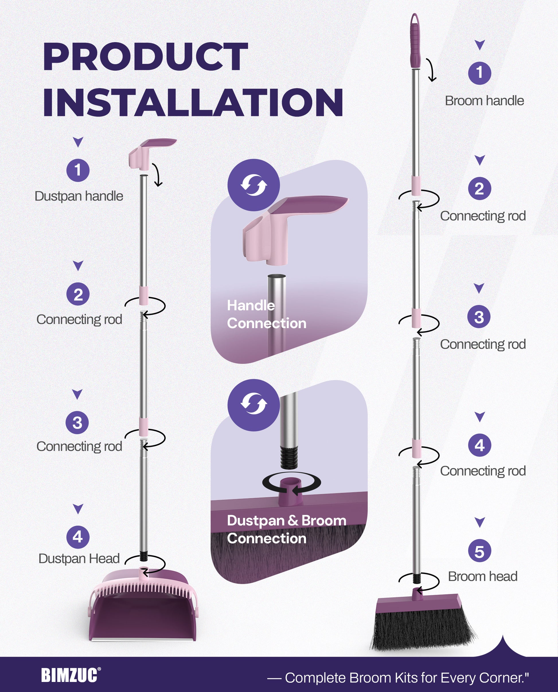 The Light Purple Broom and Dustpan Combo features a dustpan with an integrated TPR flat rubber lip that effortlessly collects all debris, ensuring nothing is swept underneath. The broom’s unique 3-layer thick bristles are gentle on wooden floors and effective on various surfaces, while its angled head makes cleaning corners and edges a breeze. Built to last, the BIMZUC broom and dustpan set is crafted from high-quality, durable materials, including rust-resistant stainless steel handles that are sturdy and designed to withstand daily use, eliminating the frustration of loose or flimsy handles. This premium cleaning set combines functionality, durability, and a sleek light purple design to make your cleaning tasks easier and more efficient.