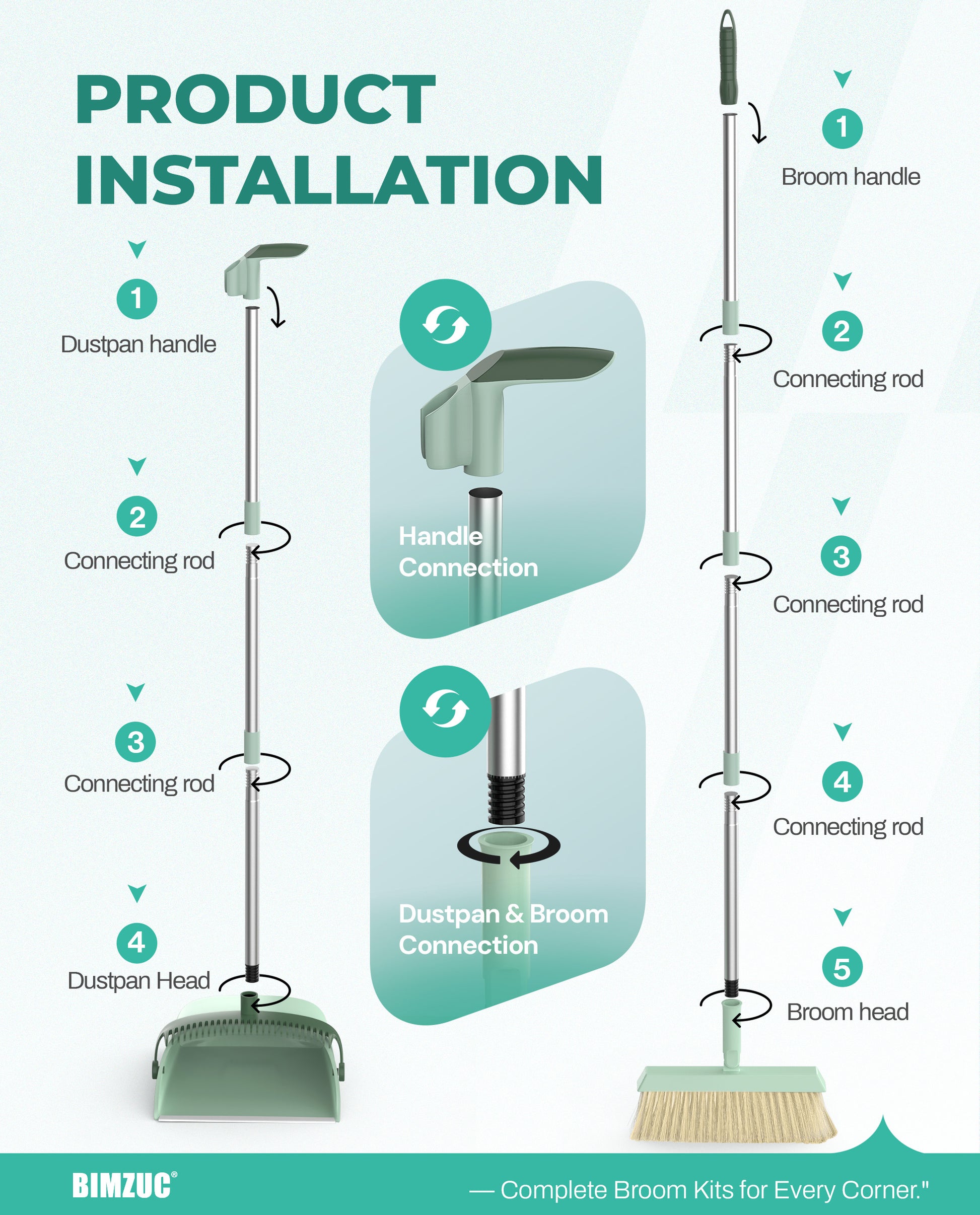 - BIMZUC Dustpan with Long Handle Stick and Extension Pole: Forget about those brooms that are too short and inconvenient! This broom has a height of 51.2" , so please adjust the length of the broom according to the height of the user. No need to bend down to reach every corner and place, even under the sofa, so that you can easily sweep and keep the space spotless!