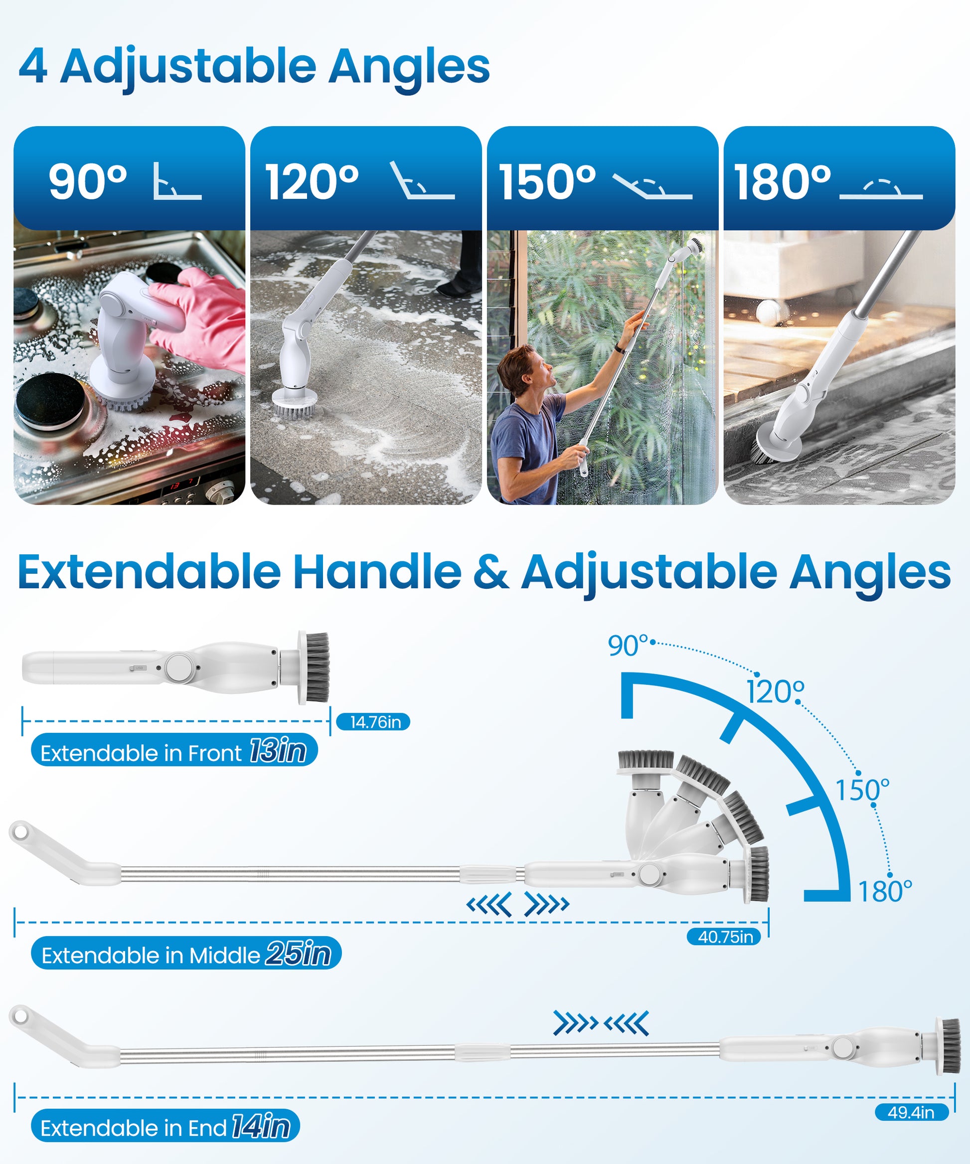 - 4 Adjustable Angles:The scrubber head adjusts to 4 different angles, including 90°, 120°, 150°, and 180°. This flexibility allows you to clean tight spaces, corners, and awkward surfaces with ease, making it ideal for bathroom tiles, floors, and other hard-to-reach areas.