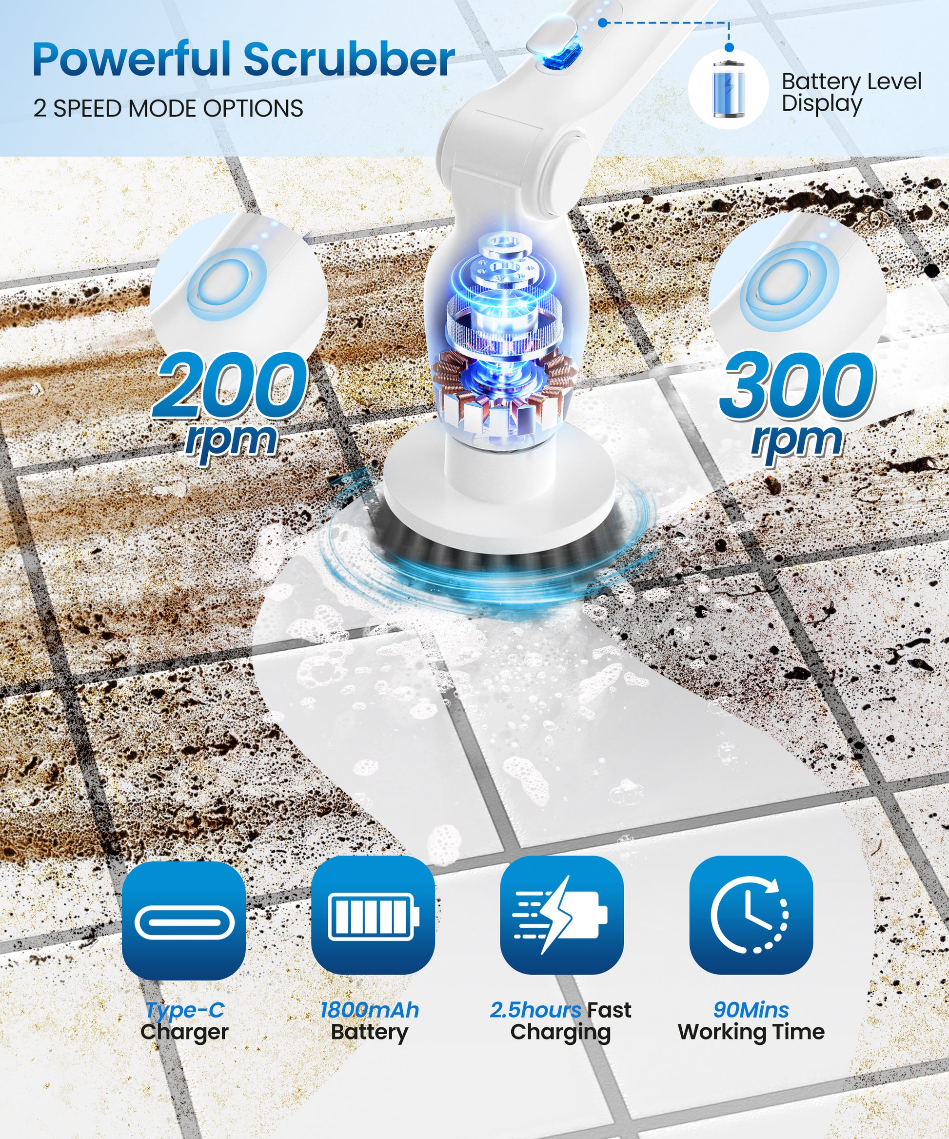 - Two Speed Options for Versatile Cleaning:With two speed settings, the scrubber lets you choose the right level of power for the job. The higher speed is good for tackling stubborn dirt, while the lower speed ensures safe cleaning for delicate surfaces like glass or polished tiles.