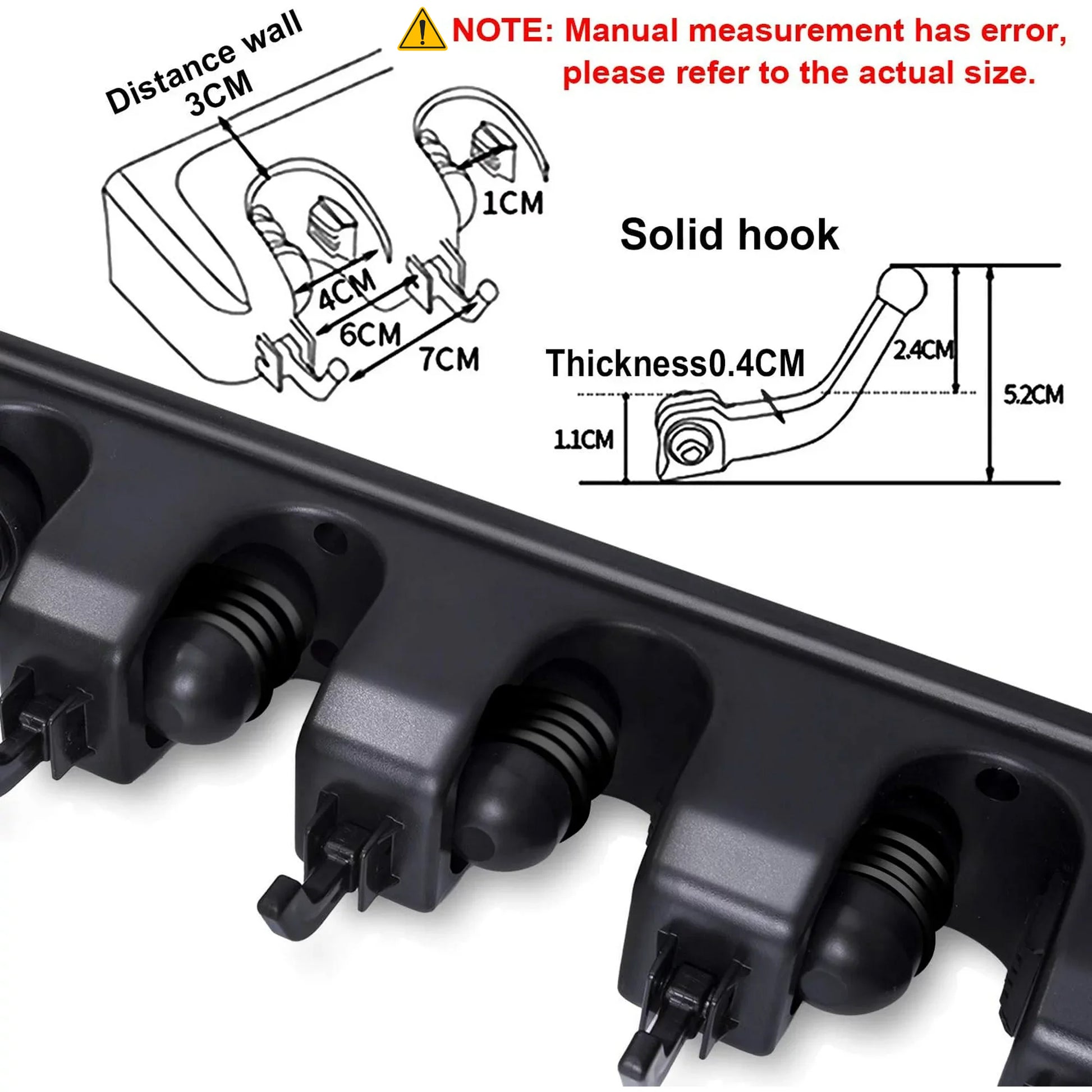 - NO-SLIDE Design Broom Organizer- 5 spring-loaded slots with rubber grips that hold tightly to tool handles to keep them firmly in place. 6 Heavy Duty hooks are movable.