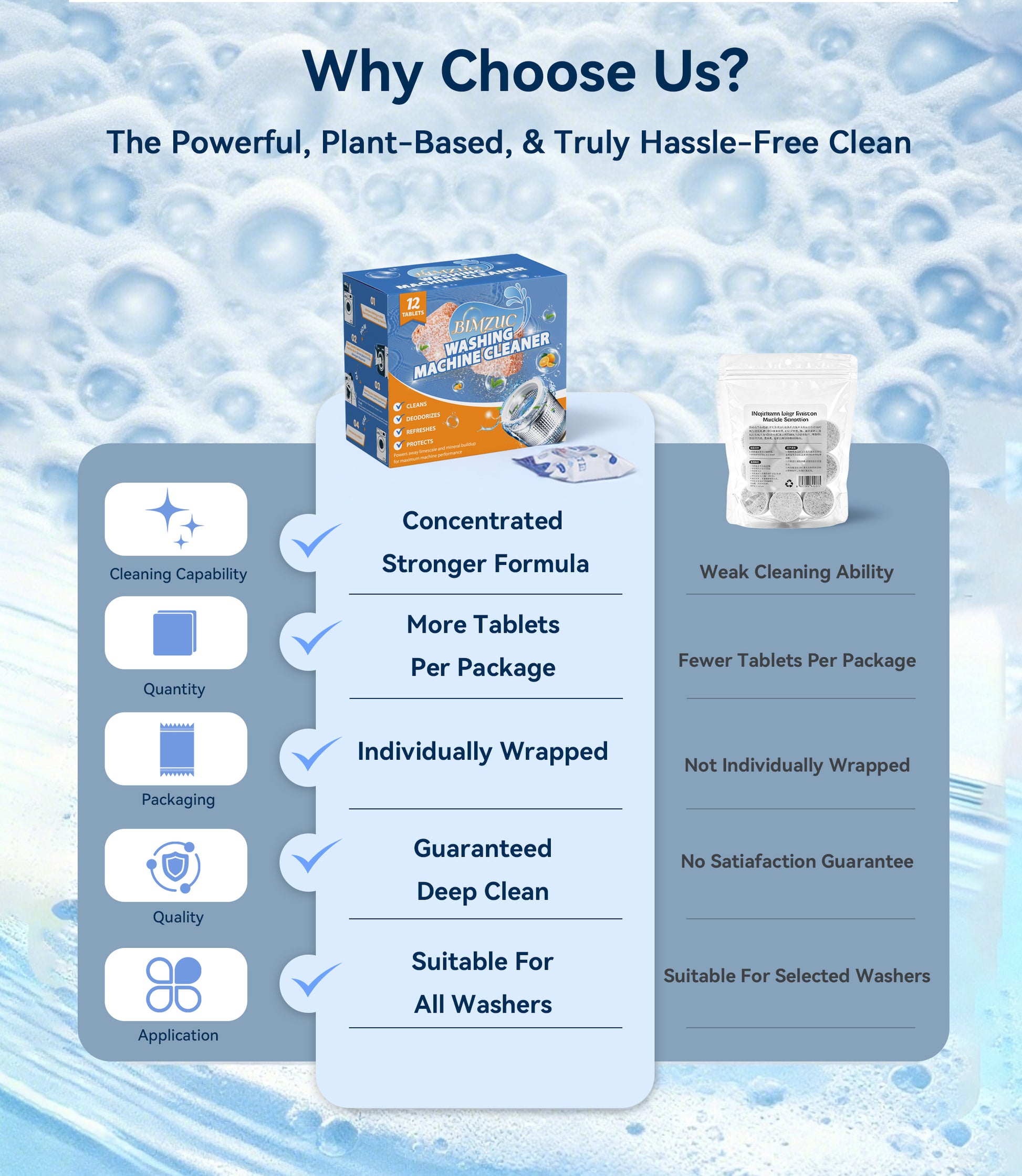 Keep your washing machine fresh and odor-free with BIMZUC Washing Machine Cleaner Tablets! Over time, detergent residue, fabric softener, and hard water deposits can build up inside your machine, leading to unpleasant smells and inefficient cleaning. Our septic safe, eco friendly tabs refresh your machine and penetrate these deep-seated buildups, making your washer shine. They also act as an odor eliminator, ensuring your clothes keep smelling fresh. Perfect for monthly maintenance, these tablets are compatible with all washing machine types, including high-efficiency (HE) models.