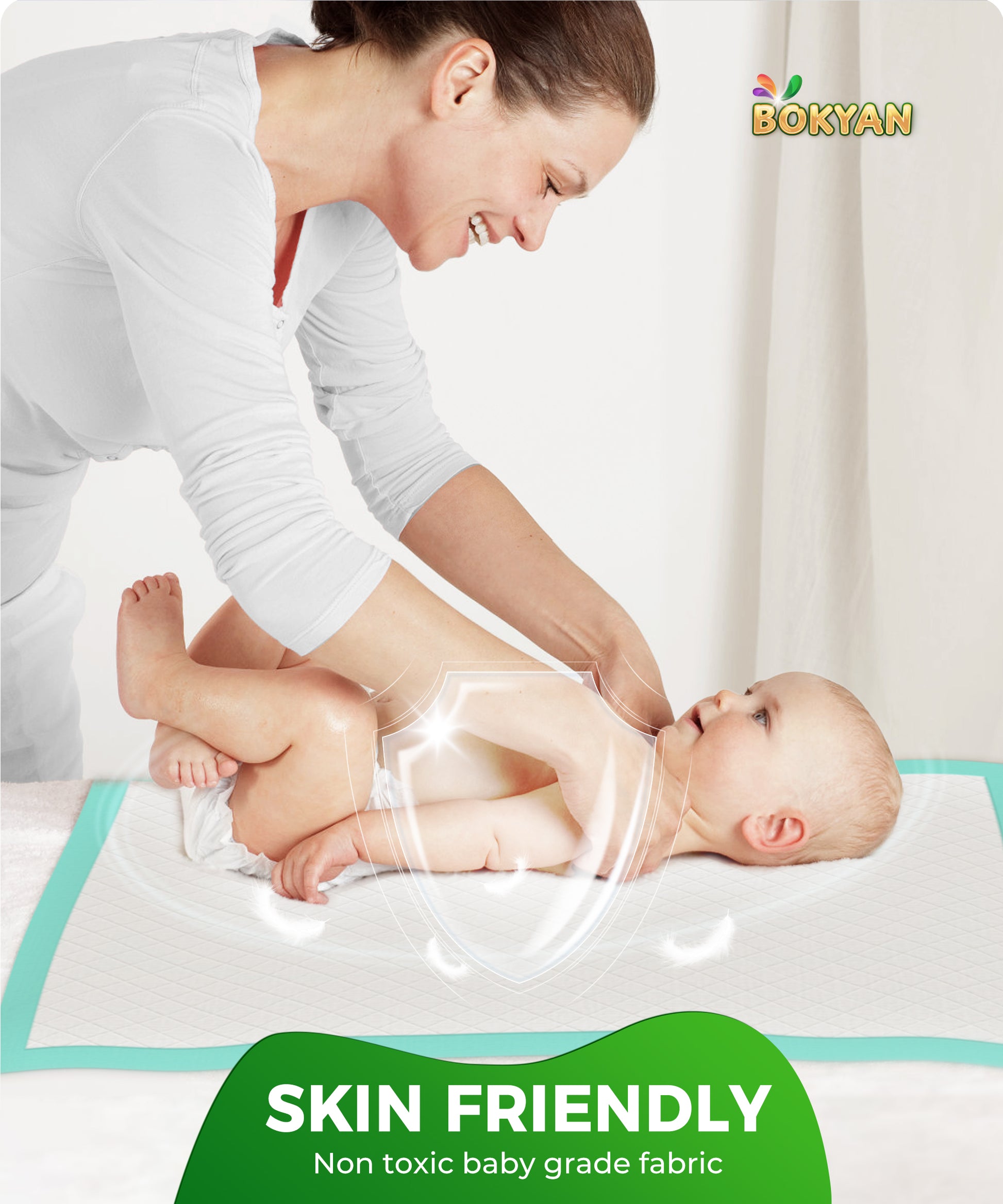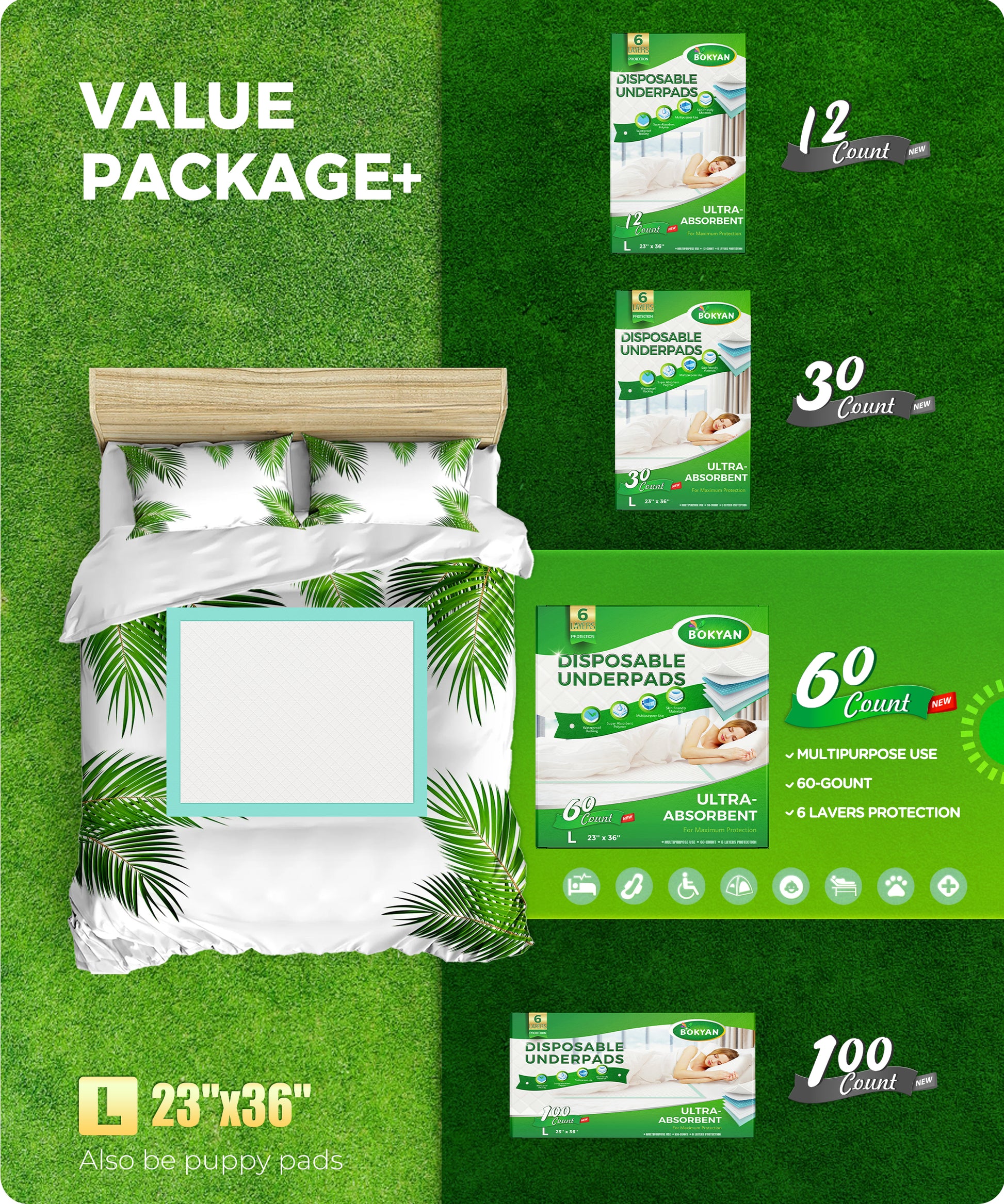 BOKYAN disposable bed pads are made with polymer bead technology to absorb liquids and reduce wetness and odor through our absorption technology. The soft fluff core and heat-sealed non-woven edges provide heavy-duty, breathable comfort during sleep or rest. Hospital grade, home comfort. Our premium waterproof chucks incontinence under pads are manufactured 100% latex-free with no irritating chemicals, salts, or dyes to prevent itching or discomfort to the skin. Featuring an efficient six-layer construction. Suitable for multiple use scenarios. Use for those with incontinence at home, hospices, or hospitals on beds, sofas, chairs, and more. Alternatively, each incontinence bed liners can be used for children who experience bedwetting and to protect surfaces when changing babies nappies.
