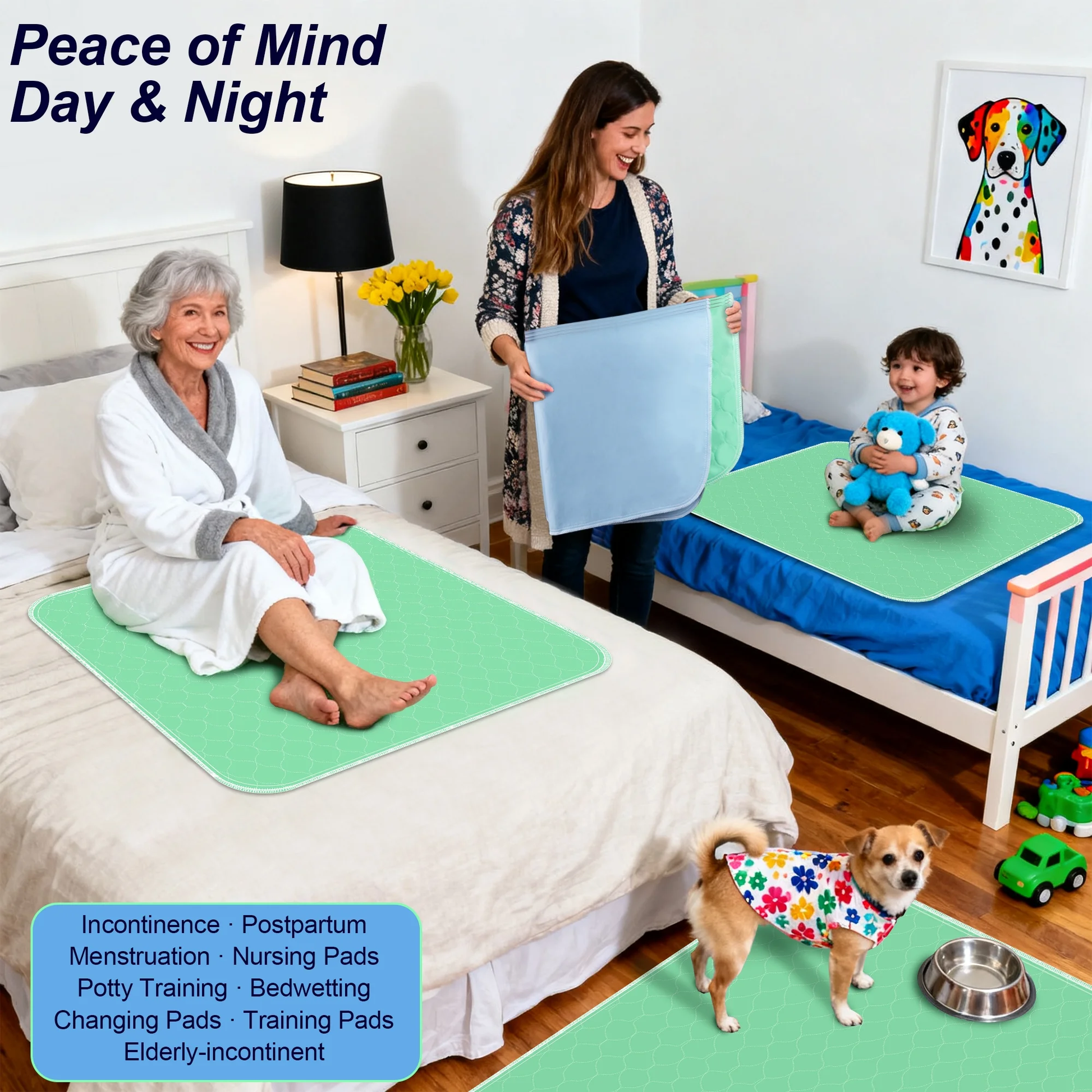 BOKYAN 4-pack reusable bed pads deliver maximum absorbency and waterproof protection for incontinence, overnight leaks, potty training, and puppy accidents. These hospital-grade washable underpads 34"x36" feature a quick-dry interior and ultra-soft waterproof surface, locking in moisture to safeguard mattresses, sofa cushions, and floors. Ideal for adults, seniors, children, and pets, these eco-friendly pads are machine washable, highly absorbent, and a cost-effective alternative to disposable chux pads and puppy training mats. Trusted for home care, hospice, and postpartum use, they provide reliable, no-leak protection night after night.