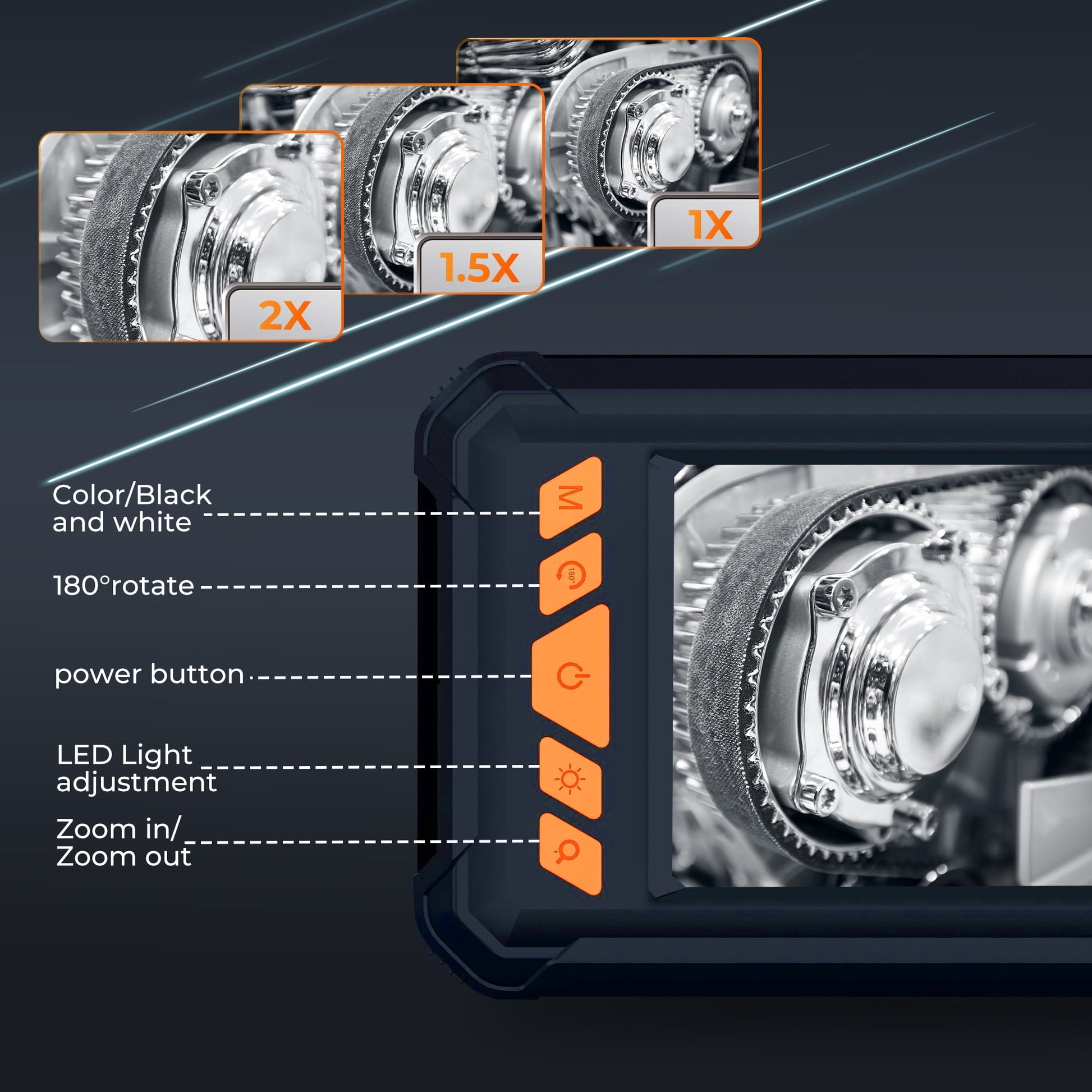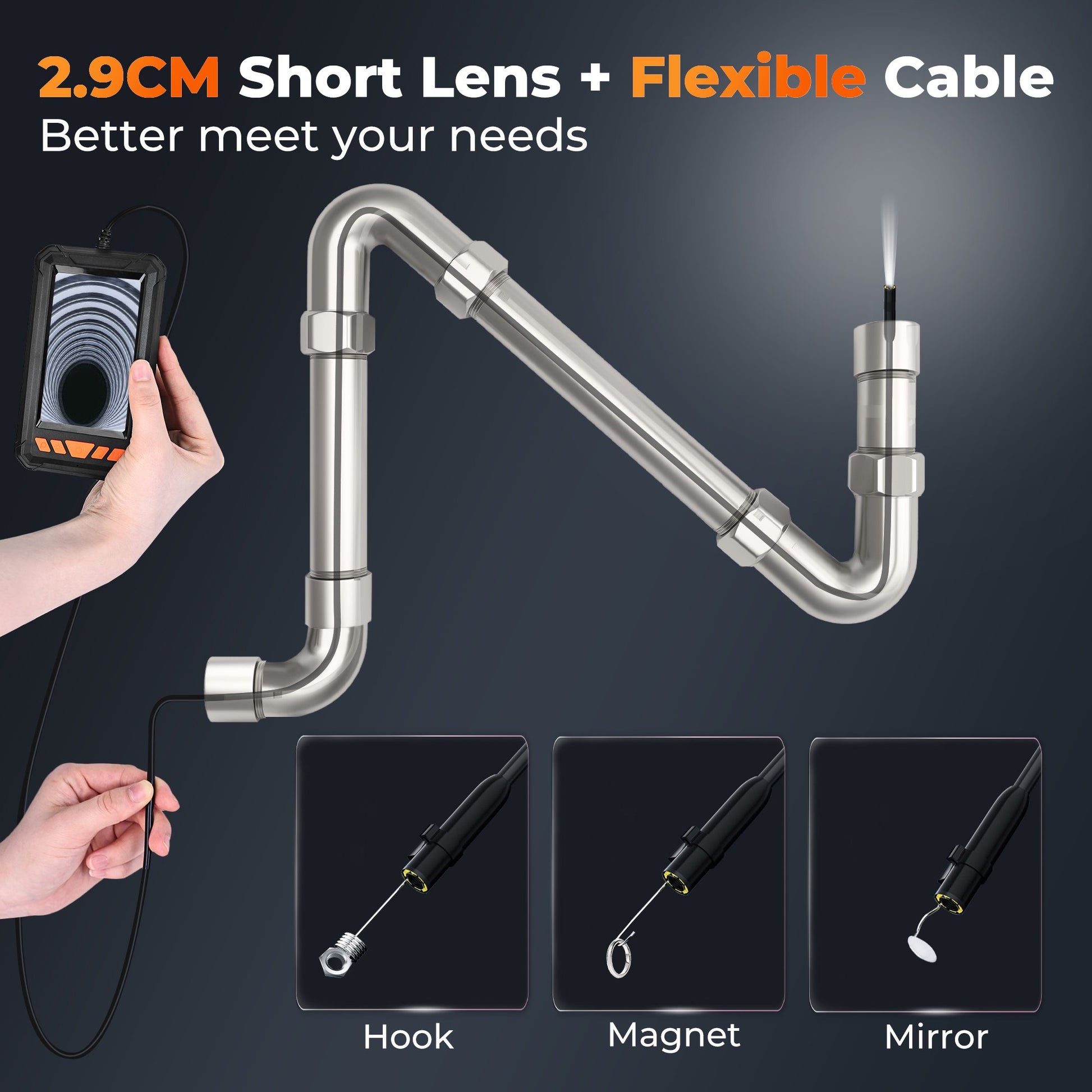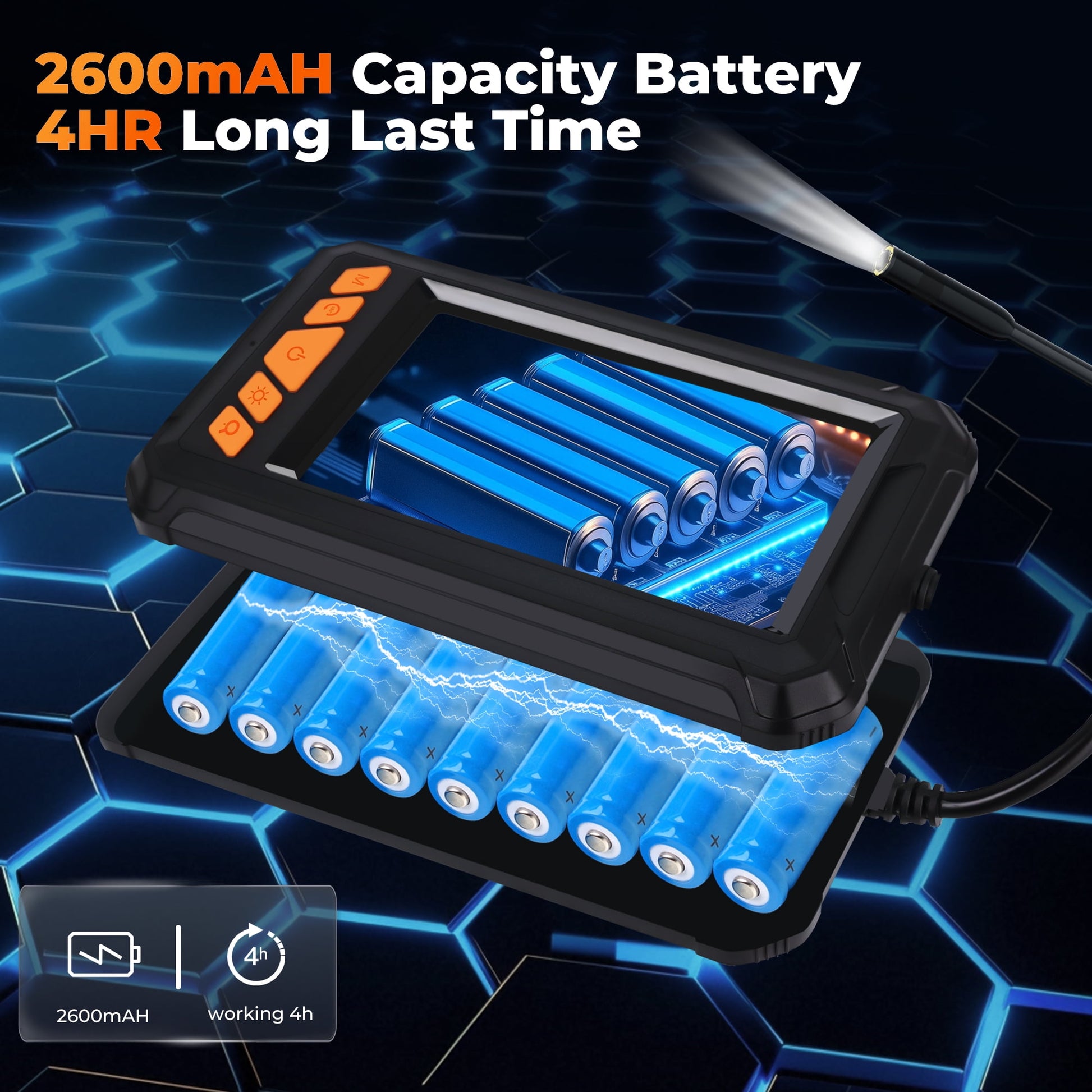 This dual-lens borescope endoscope camera features a front and side 78° lens, providing a combined 156° wide field of view at the push of a button. The optimal focal distance is 3cm–10cm, delivering clear, detailed images. With IP67 waterproof protection and 3 adjustable LED brightness levels, the inspection camera captures sharp visuals even in dark or wet environments. The 16.5ft semi-rigid cable bends and holds its shape, making it easy to inspect pipes, automotive engines, HVAC systems, and other hard-to-reach areas. Powered by a 2600mAh rechargeable battery, this endoscope supports up to 4 hours of continuous use per charge, ensuring reliability for household and professional inspections.
