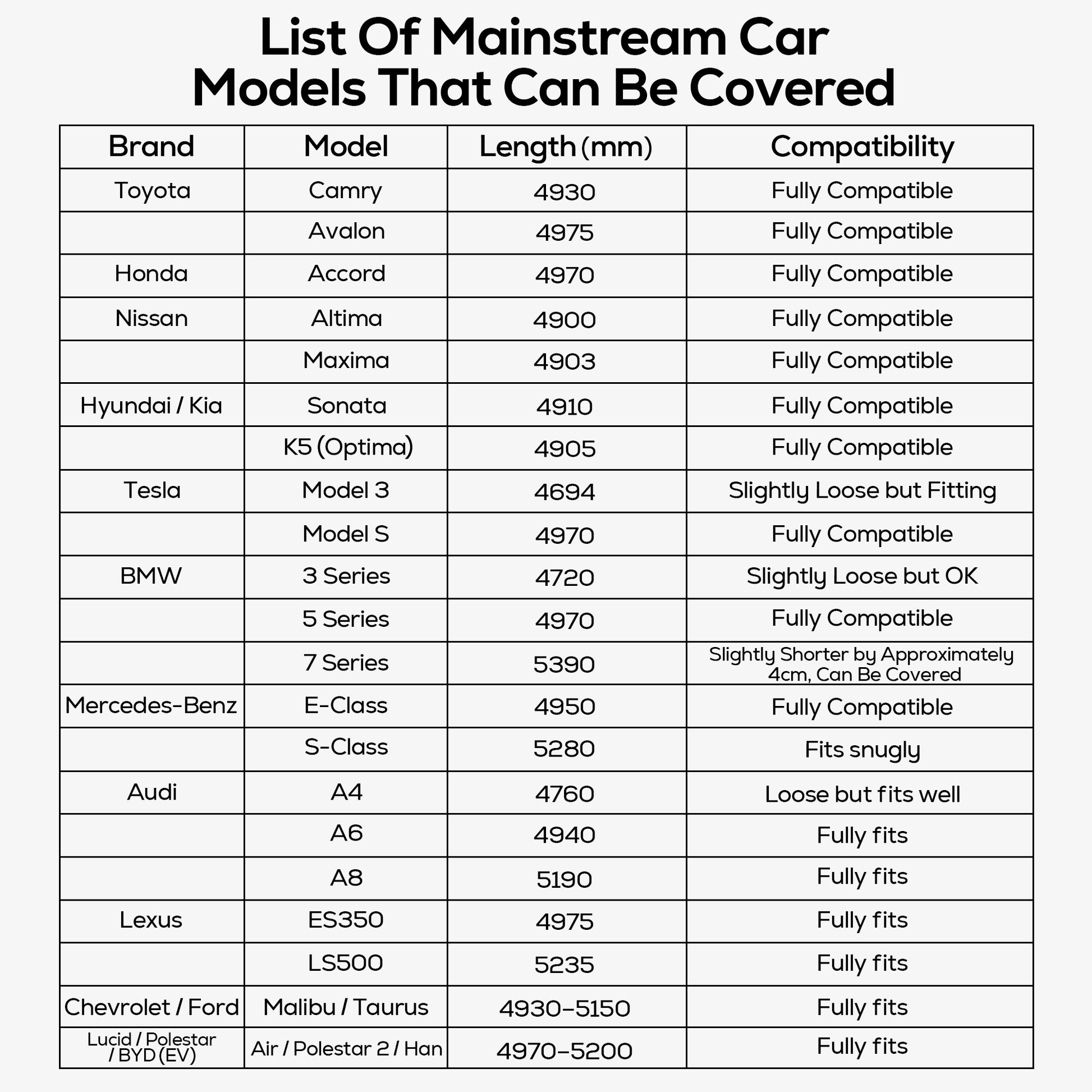 - 【Universal Fit for Large Sedans】 210" x 59" x 47". Ideal for popular full-size sedans such as Toyota Avalon, Honda Accord, Tesla Model S, BMW 5 Series, and Mercedes-Benz E-Class. Please check your vehicle’s dimensions before ordering for the best fit.