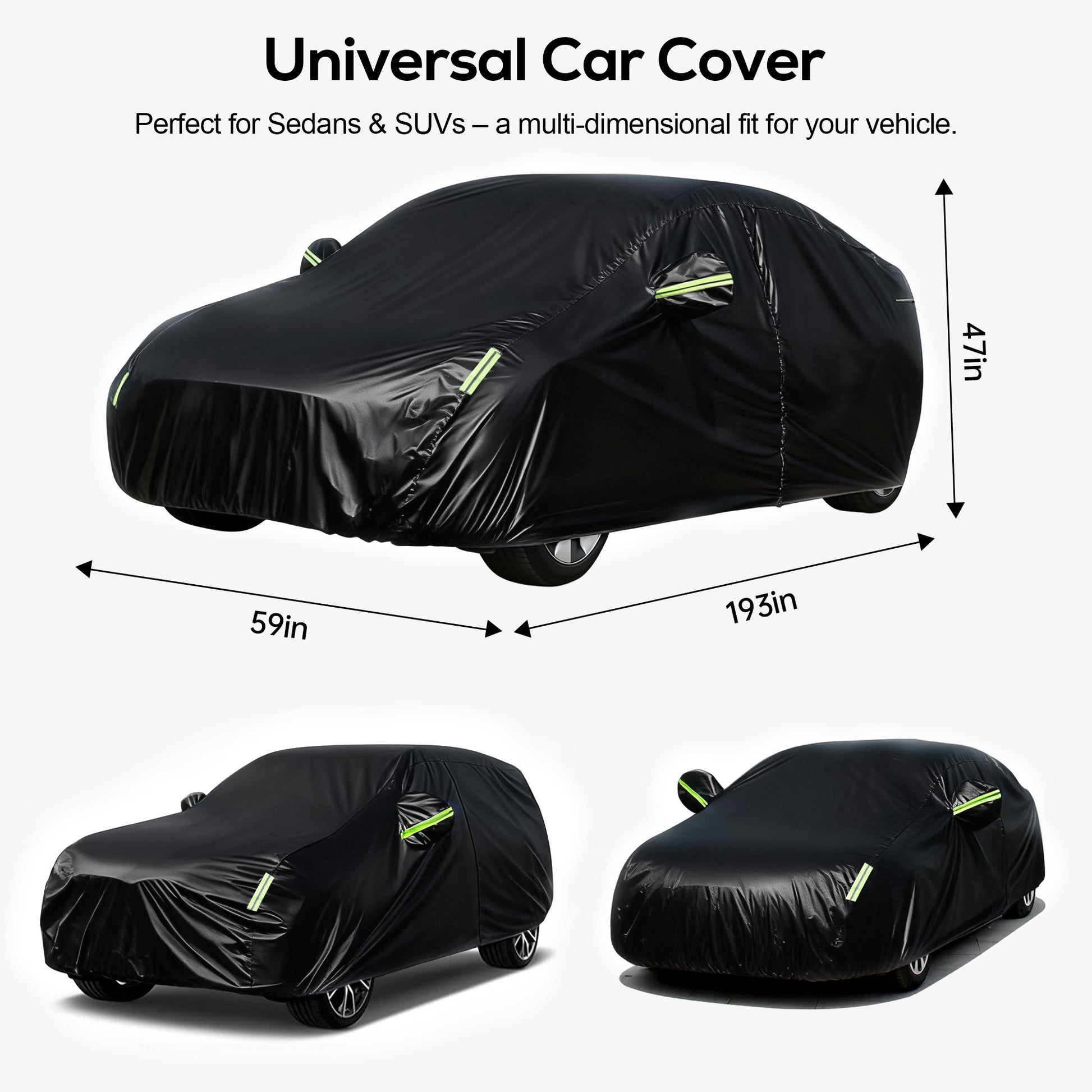 Engineered for Complete All-Season Vehicle Protection, the Floray Car Cover offers advanced protection for sedans against rain, snow, UV rays, dust, and falling debris. Constructed from high-density, waterproof polyester, it features an innovative dual-layer design: The matte black outer shell is engineered to efficiently absorb sunlight for faster winter snow melt and enhanced water beading, while the soft, silver inner lining is certified scratch-free and prevents color transfer, ensuring your paint stays pristine. A built-in zipper on the driver’s side allows quick and easy access to your vehicle without removing the cover. Windproof straps and elastic hems ensure a secure fit, even in strong winds. Reflective safety strips enhance visibility at night, while the breathable fabric helps reduce moisture buildup. Perfect for year-round outdoor or garage use, this cover provides a reliable, durable shield for your vehicle in any environment.