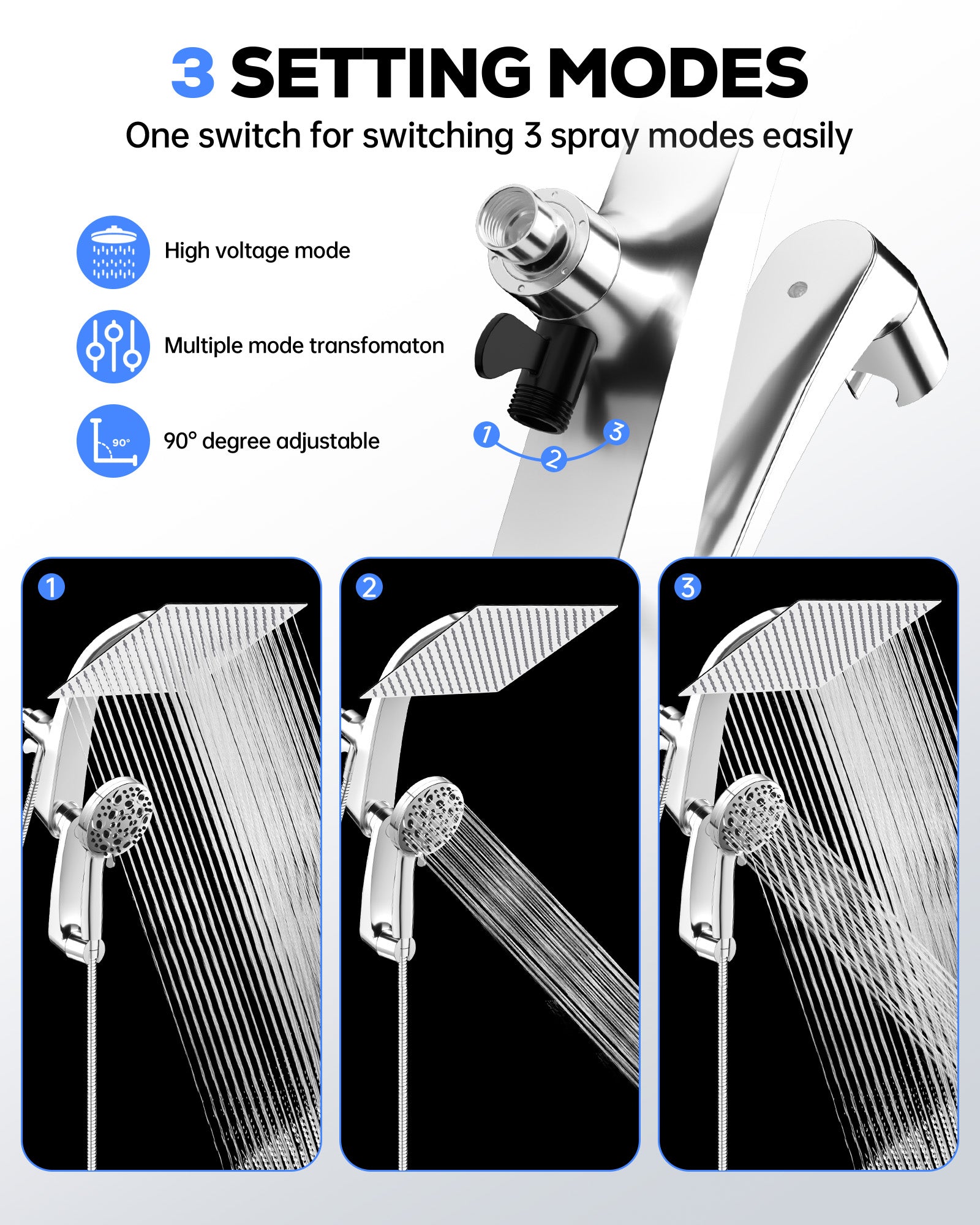 HODVIT Upgrade Your Shower Experience! This high pressure showerhead combination comes with a rotatable shower head and a detachable 10 spray handheld showerhead. It also upgrades the shower head bracket and designs an extension arm that can rotate 360°. The shower head height can be adjusted as you wish, taking into account the height of adults, the elderly and children, and can achieve maximum flexibility. Enjoy a luxurious rinse, and the powerful jet can increase water pressure for a refreshing, spa-like feeling.