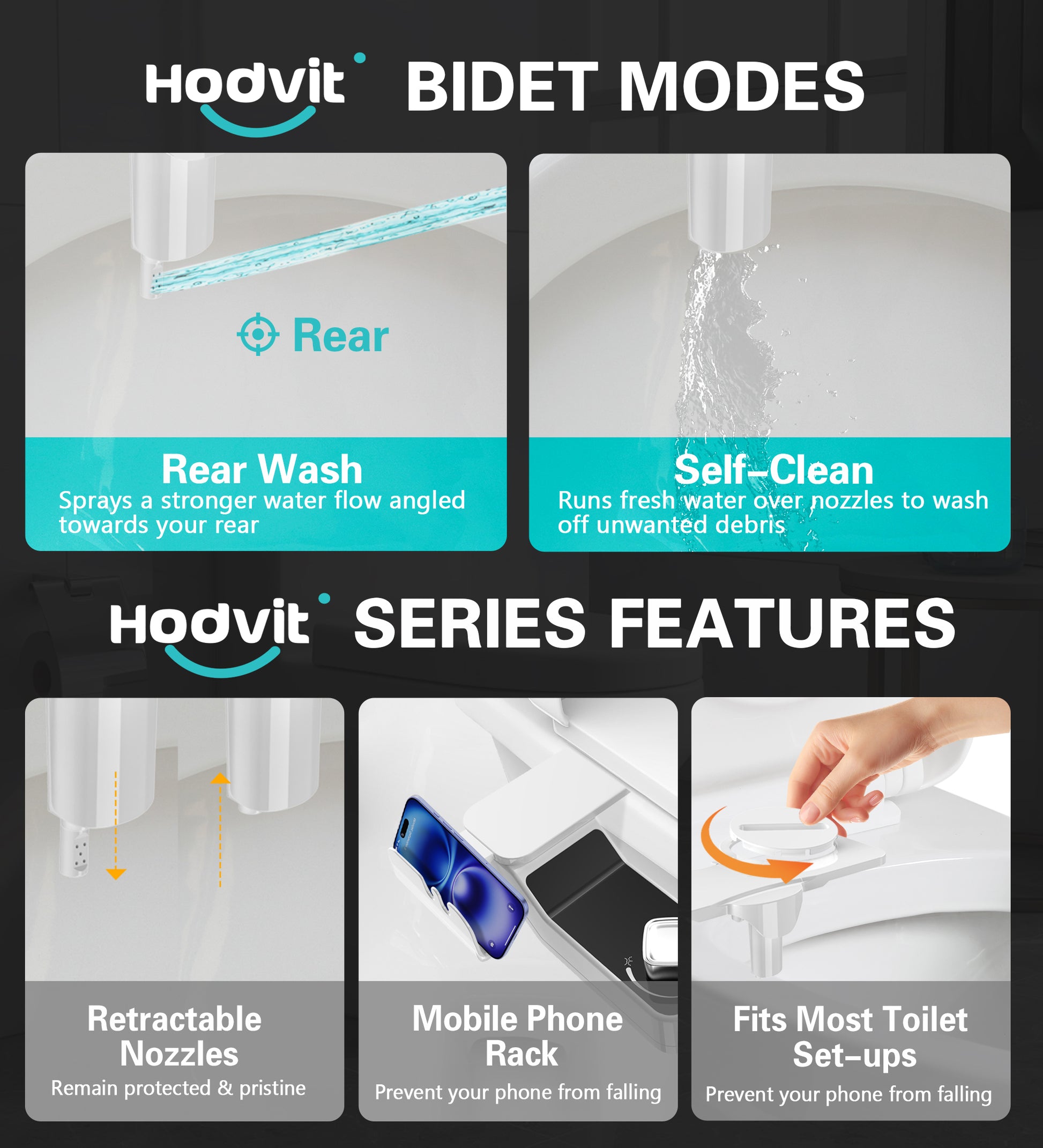 Hodvit Non-Electric Bidet Toilet Attachment, Dual Nozzle with Self-Cleaning, Adjustable Pressure Control