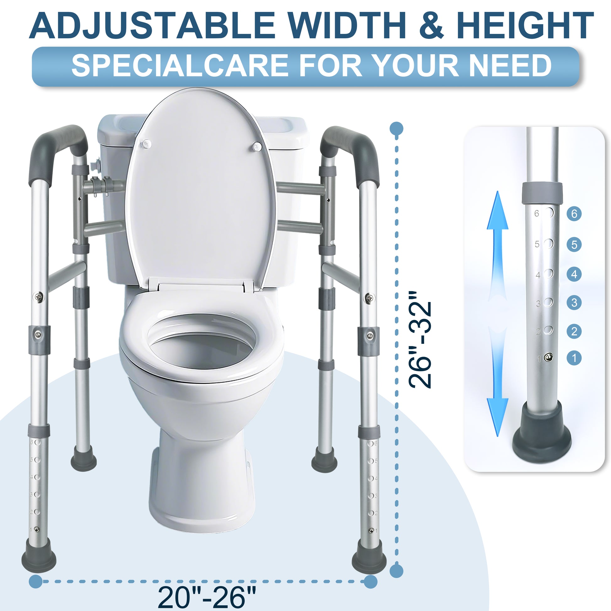 - Adjustable Width & Height: The compact toilet safety rail can be used with any standard elongated or oval toilet. Handles can be adjusted from 22" to 26"wide providing a comfortable amount of space above the toilet. Toilet Rail height is also adjustable from 26" to 32".