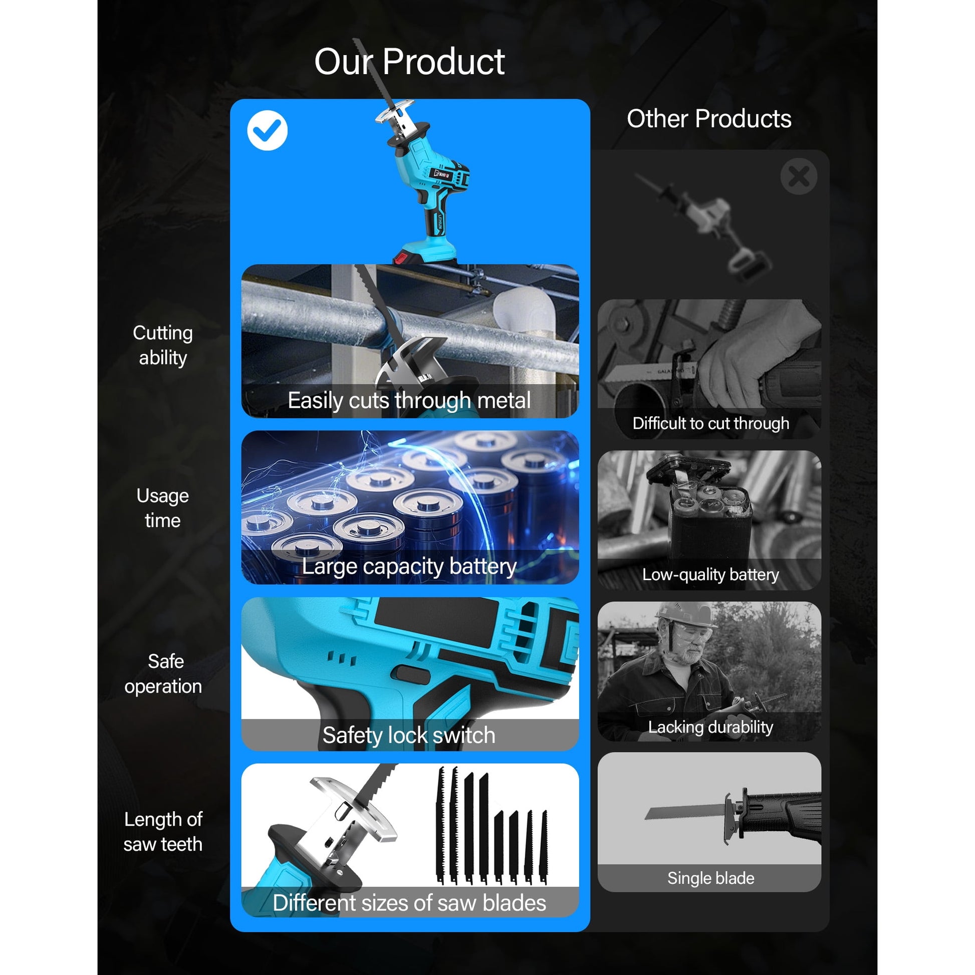 - 717097065712Efficient and Safe Cutting: This cordless reciprocating saw is equipped with a high-performance motor with variable speed control for smooth and precise cutting on different materials. The safety lock button prevents accidental activation and the non-slip handle ensures a secure grip.