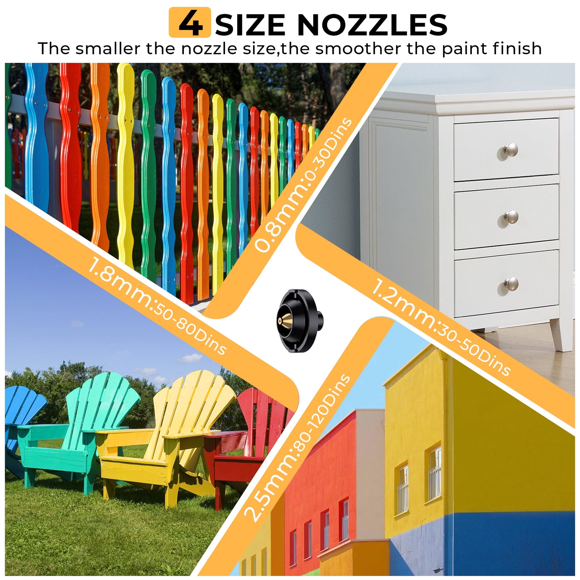 - 4 Nozzles & 3 Spray Patterns:Includes 0.8mm, 1.8mm, 2.2mm, and 2.6mm nozzles with horizontal, vertical, and circular spray modes—perfect for furniture, walls, doors, and more.