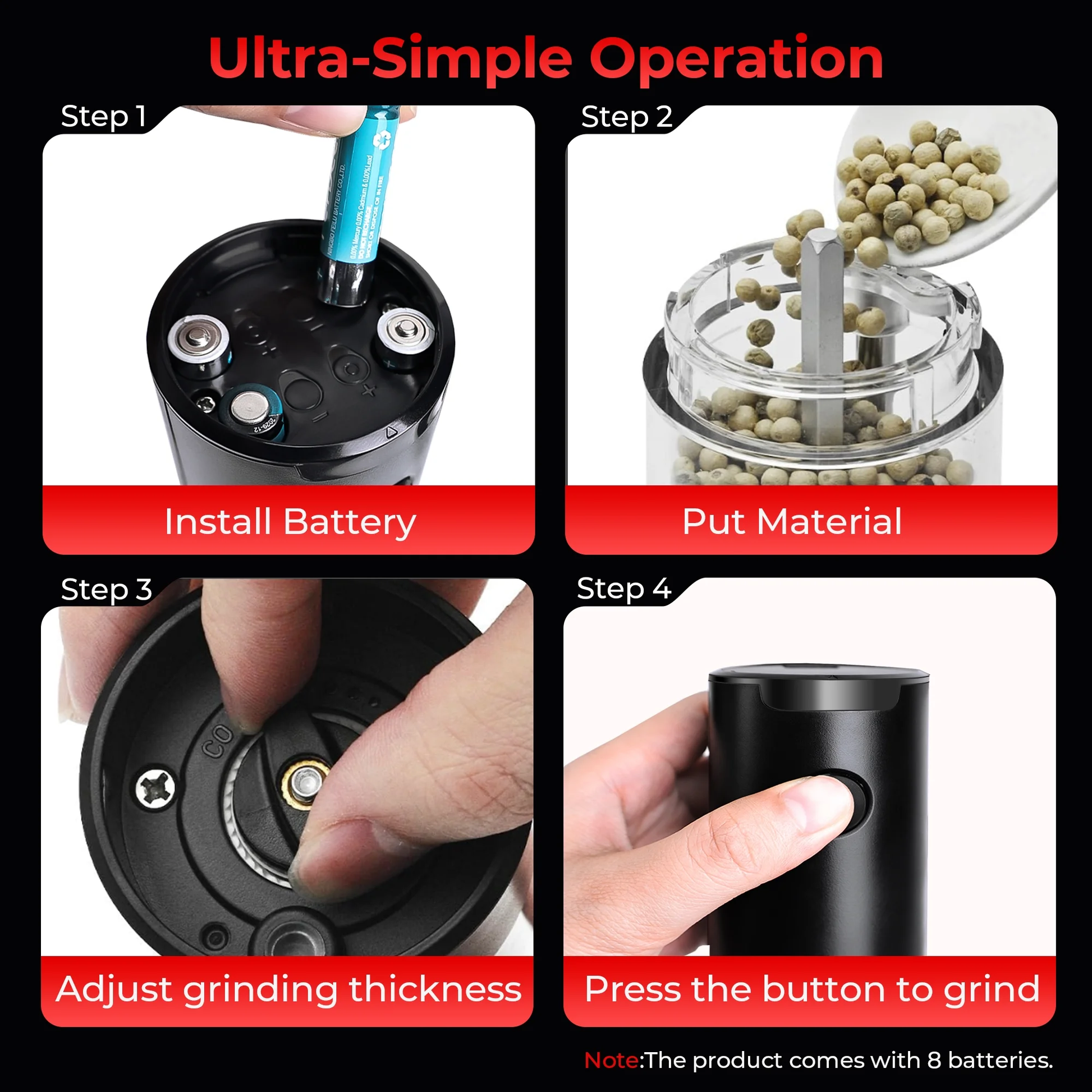 - [Battery Powered One Button Operation]: The salt and pepper grinder set is battery powered and requires 4 AAA batteries (included). Effortlessly grind your spices by simply pressing the switch. Release it to stop, allowing you to control amounts of salt or pepper while cooking.