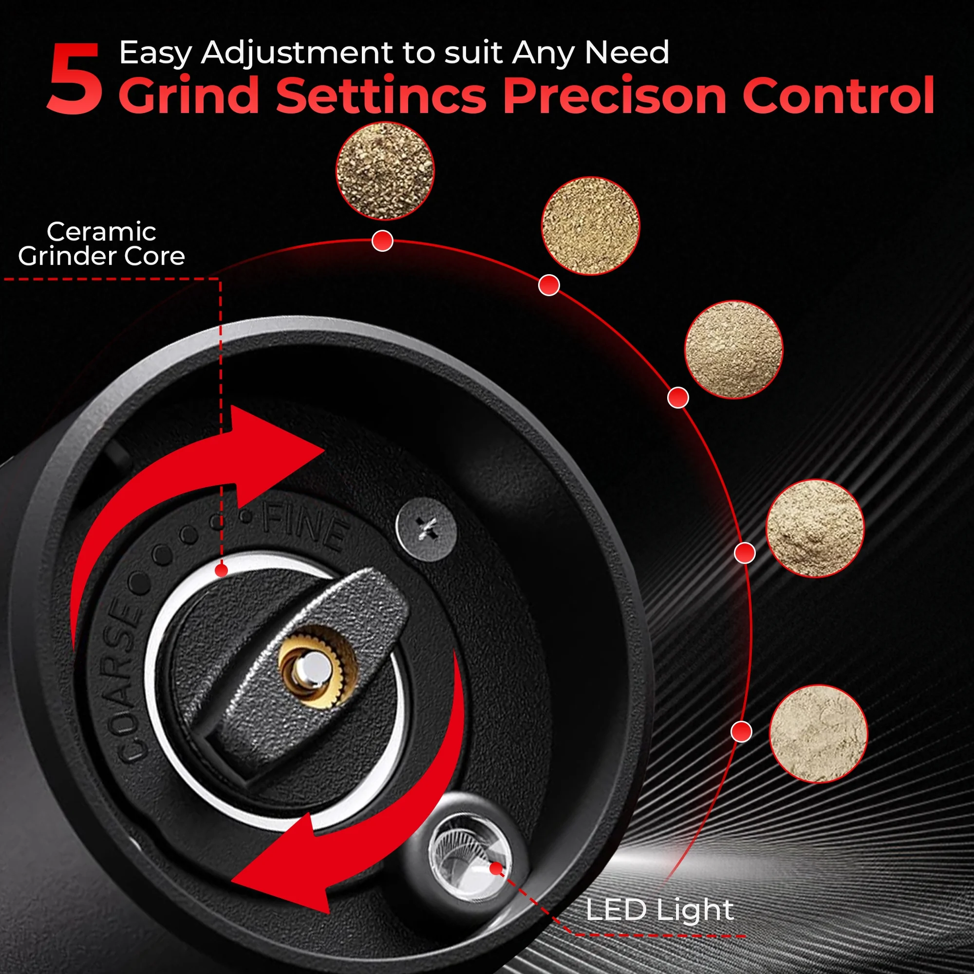 - [6-level Adjustable Coarseness Pepper Grinder]: 6-level adjustment knob lets you customize the grind size to your preferred coarseness, whether you prefer a fine or coarse grind. Easily twist the knob to achieve your desired level of coarseness. Effortlessly meeting diverse cooking demands and helping you create richly flavored dishes for family.