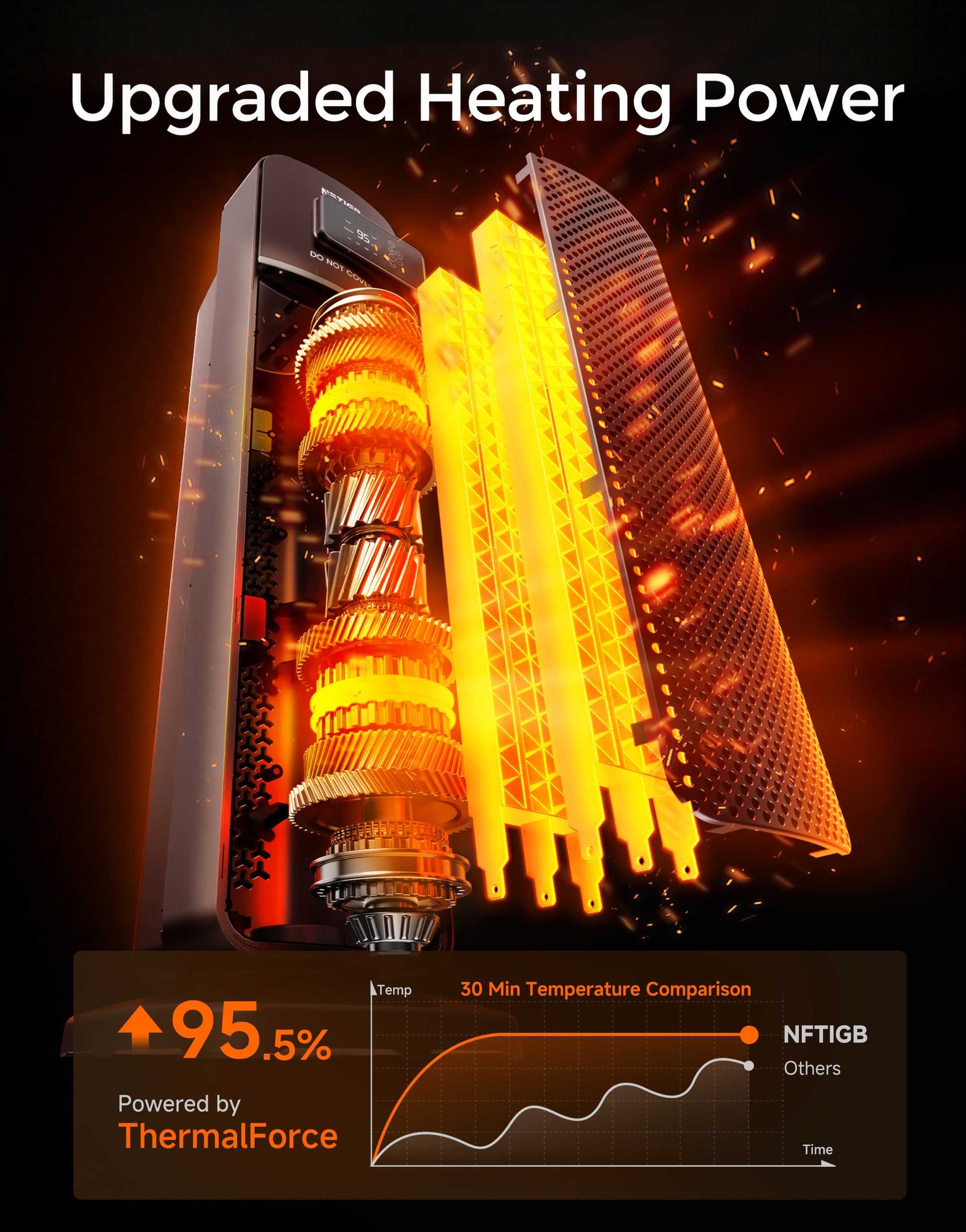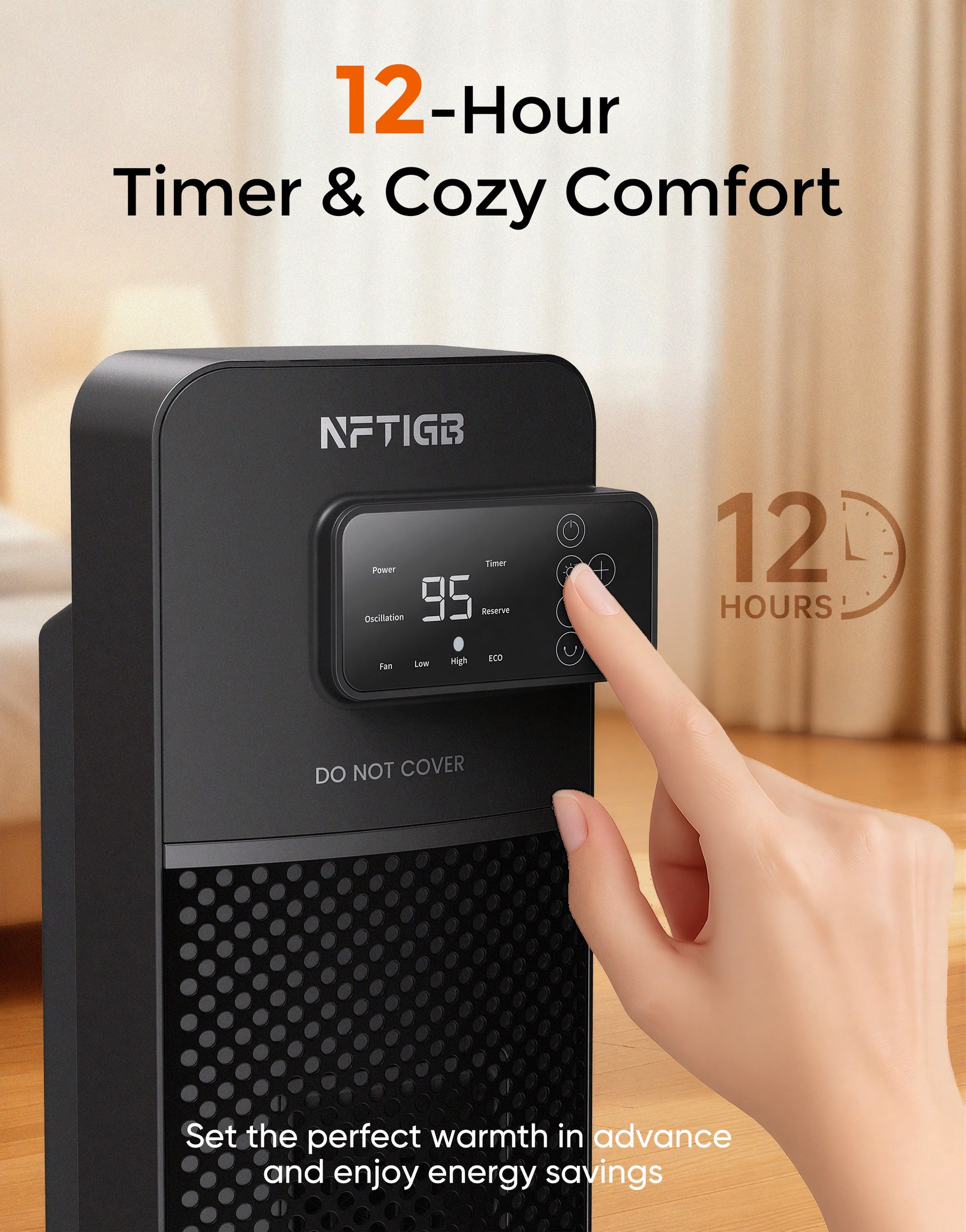 Prepare for winter with this fast-heating NFTIGB 1500W PTC ceramic space heater featuring a powerful twin DC motor for rapid warmth in seconds. Designed for large rooms, it offers 70° oscillation to distribute heat evenly across bedrooms, living rooms, offices, and more. Safety is prioritized with ETL certification, V0 flame-retardant materials, and automatic shutoff on tip-over or overheating. The smart thermostat with ECO mode adjusts heating to maintain a comfortable temperature while saving energy. Customize your comfort with three heat settings, fan-only mode, and a 12-hour timer for quiet, efficient warmth exactly when you need it.