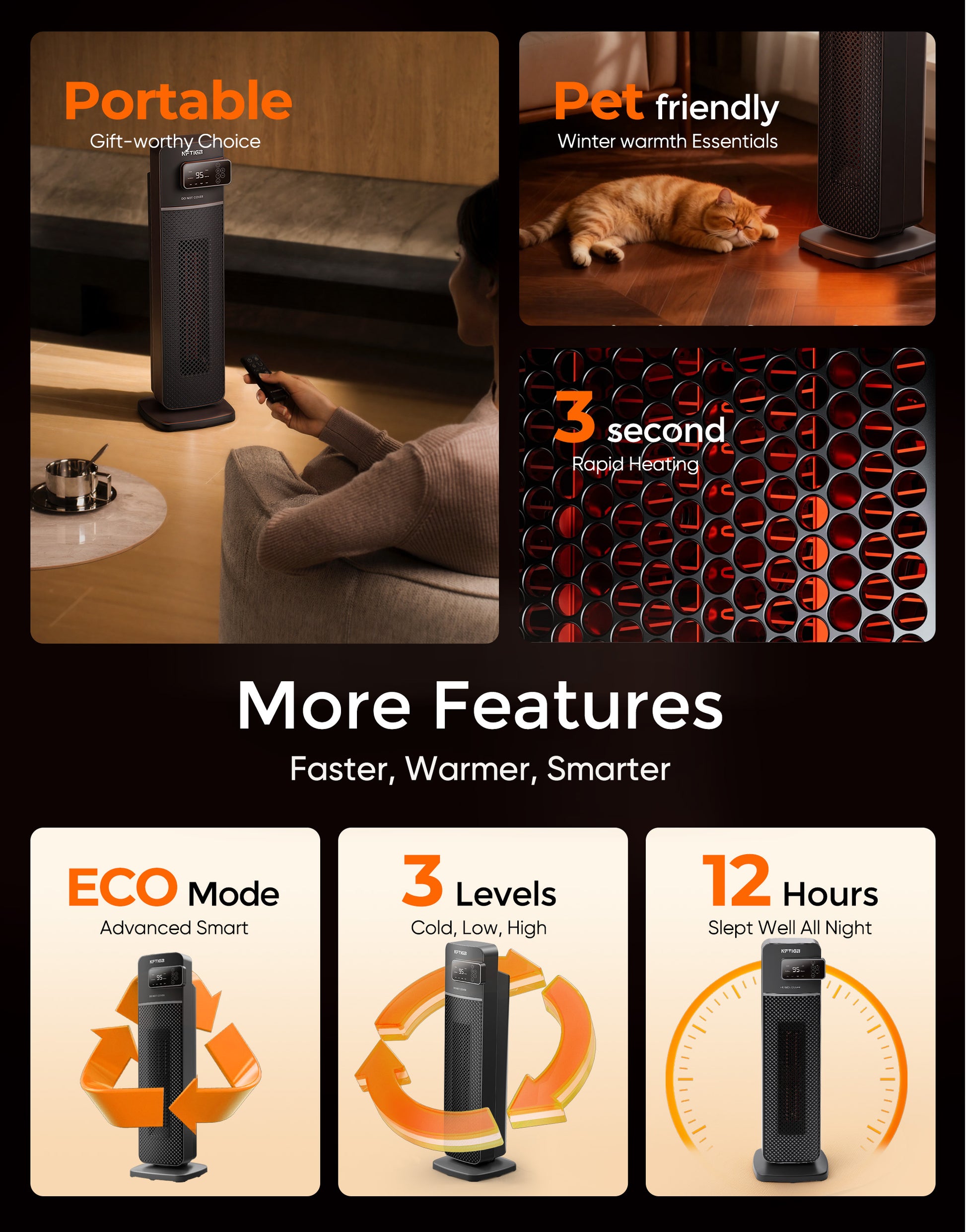 - Fast and Efficient Heating: Powered by a strong twin DC motor and advanced 1500W PTC ceramic technology, this space heater delivers rapid warmth with in 2s.It is perfect for bedrooms, living rooms, offices and more, ensuring consistent comfort even in cold seasons.