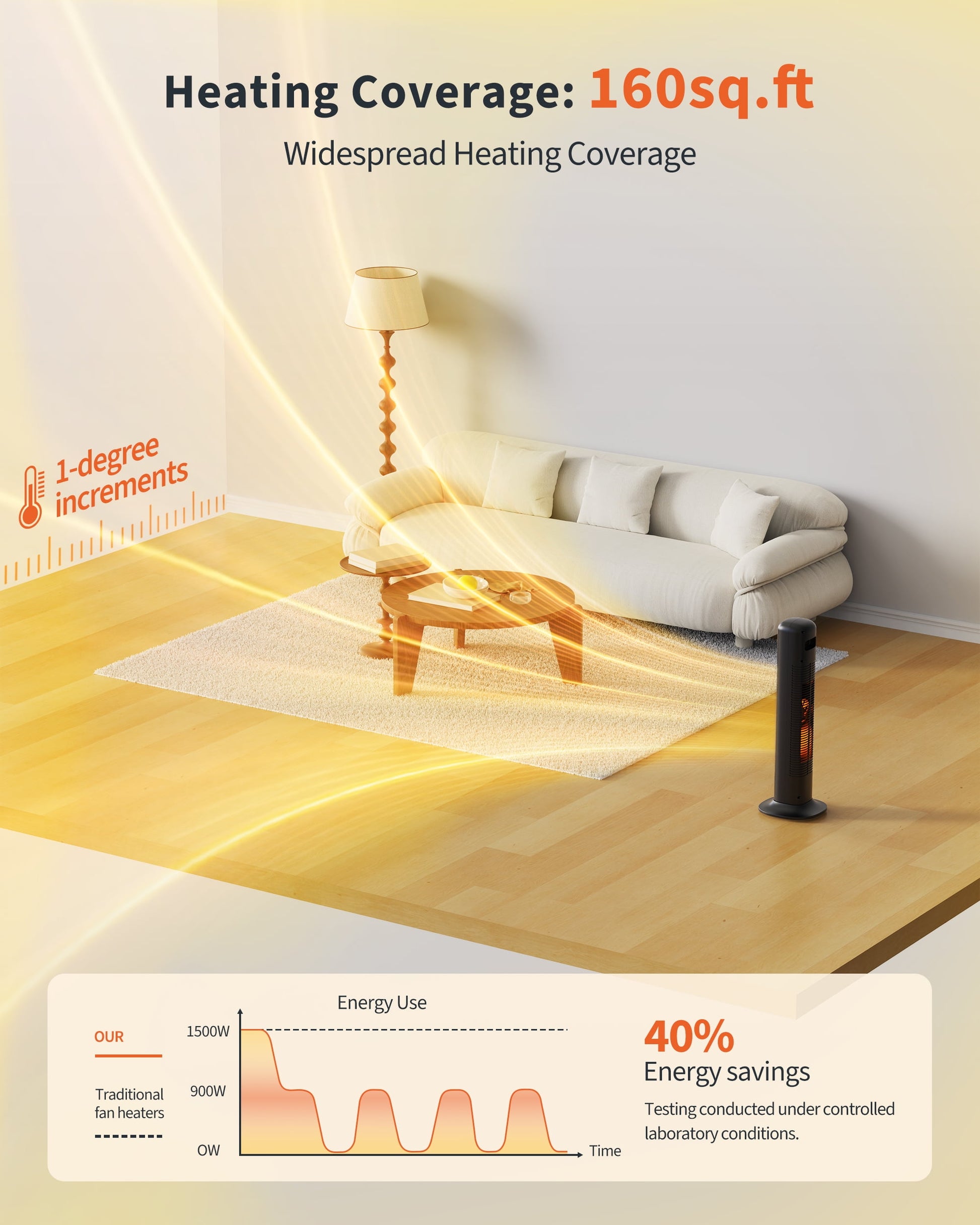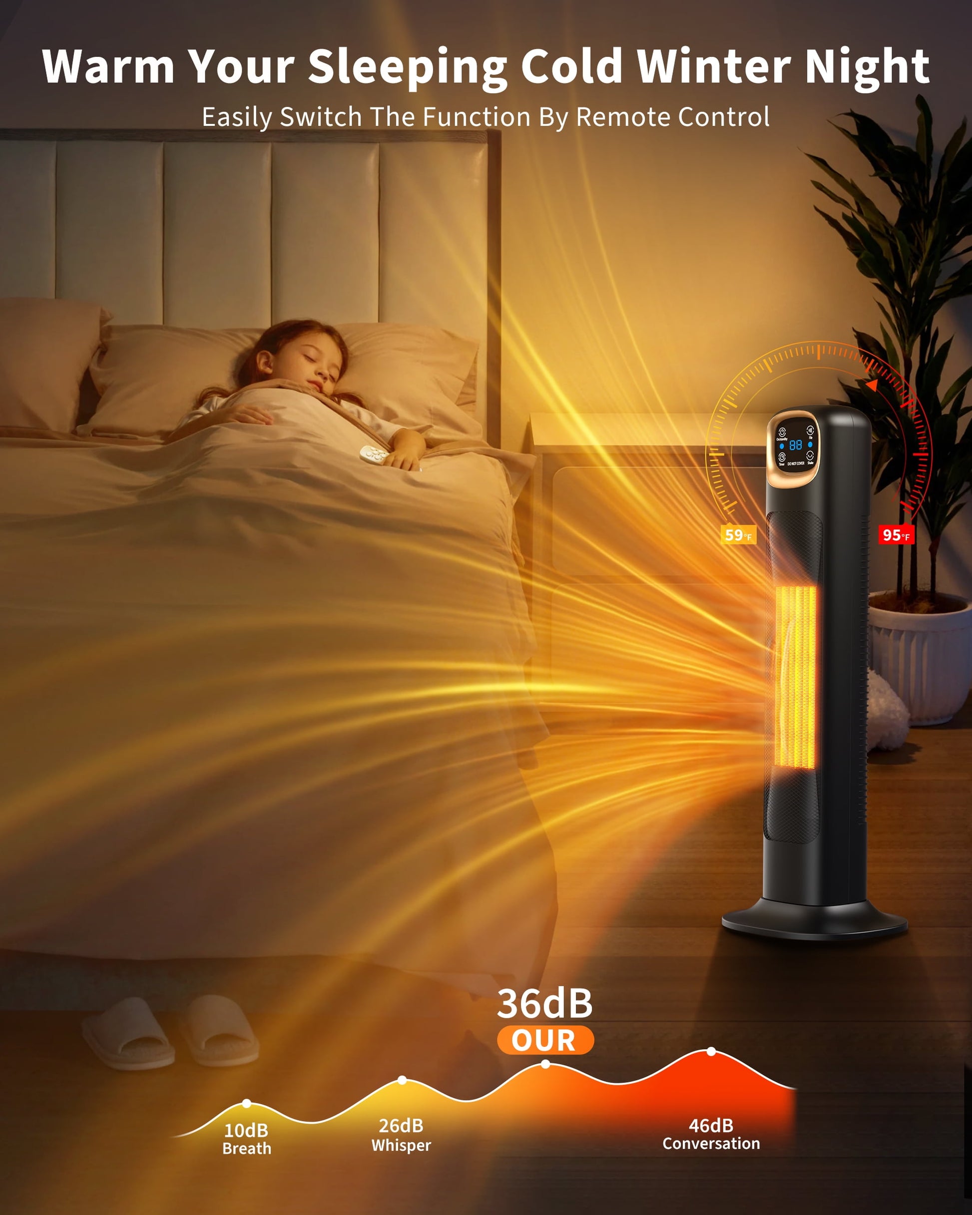 Easily adjust settings with the included remote control, whether you're on the couch or in bed. Choose from three modes: high heat, low heat, or natural breeze for milder weather. The 60° oscillation ensures wide, even heat distribution, creating a cozy, comfortable atmosphere throughout your space.