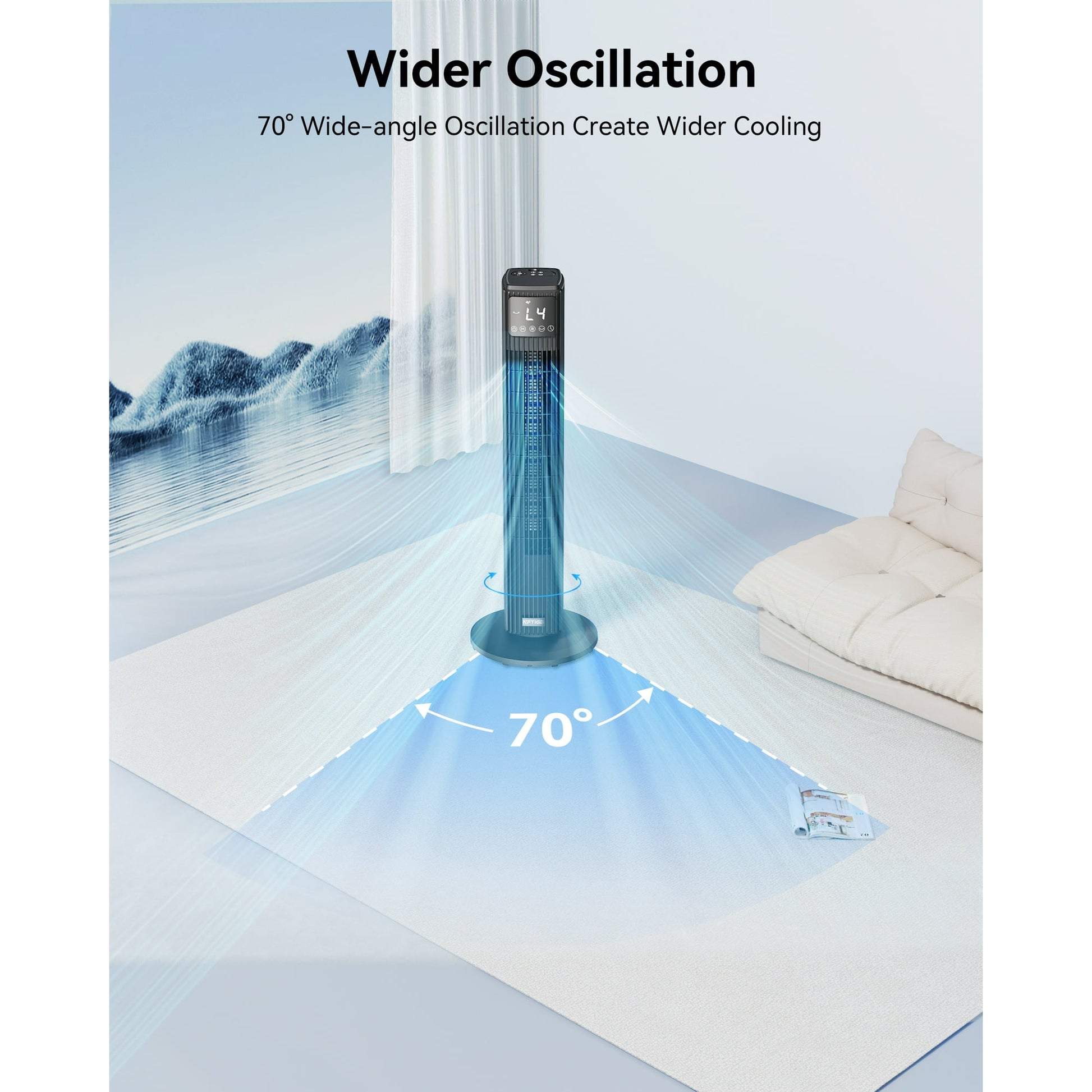 - Powerful Airflow & Wide Oscillation:With a maximum wind speed of up to 25ft/s and a 70° wide-angle oscillation, this fan ensures rapid air circulation and covers the entire room. Whether you're in the corner or the center of the room, you can enjoy refreshing cool air, making it perfect for cooling larger spaces.
