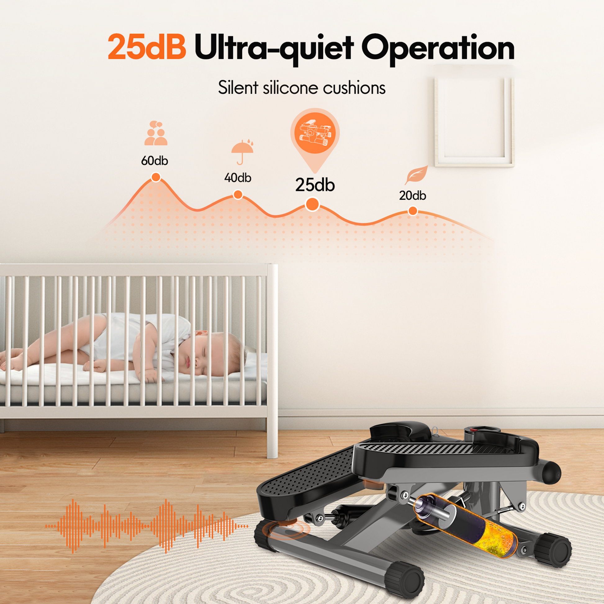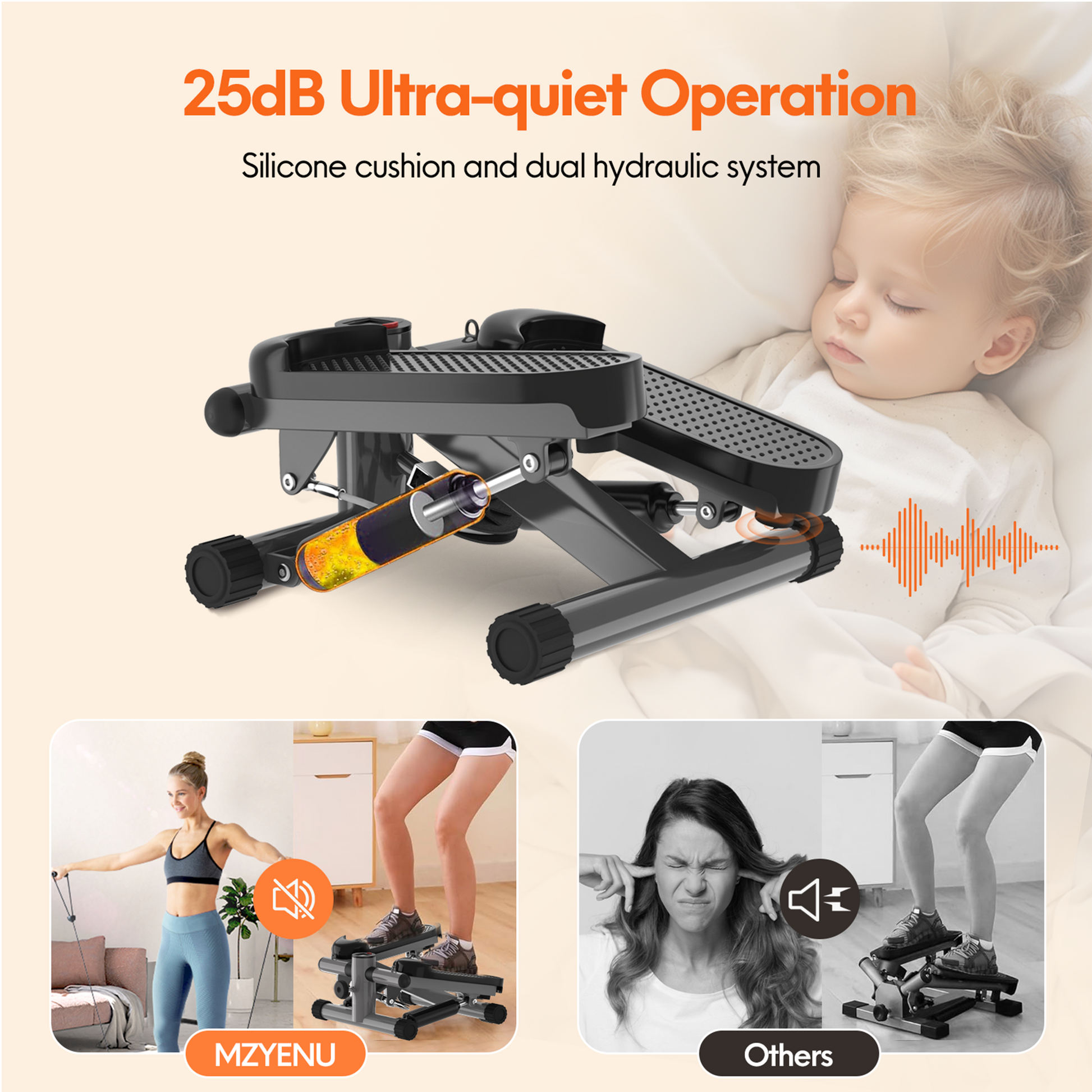 - Super Quiet Design - This mini stepper exercise machine offers smooth and ultra-quiet hydraulic drive system and ensures stability and increased resistance while reducing noise from friction. During exercise, it operates at a decibel level of 25 dB, ensuring a quiet workout that does not disturb other people. Comes with a free stepper mat, which is a equipment extra you get to avoid scratching the floor and generating noise.