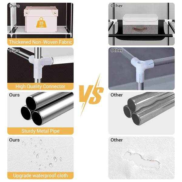- STURDY ARCHITECTURE: Crafted from durable non-woven fabric and featuring a high-quality zipper, the wardrobe closet for hanging clothes is constructed with strong steel tubes and reinforced PP plastic connectors. Thicker than most tubes on the market, it provides exceptional load capability, ensuring sturdiness and stability. Resistant to bending, this wardrobe proves to be durable and functions for years.