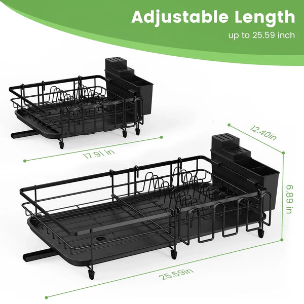 - Retractable DISH RACK for SPACE SAVING - The Retractable dish drying rack includes 1 dish rack, 1 Utensil Holder, 1 cutting board holder, 1 cup rack and 1 Removable Drain Board. It's designed to save space in your cooking and cleaning area. A must-have for any kitchen which accompany your needs during hand washing your dishes and drinkware.