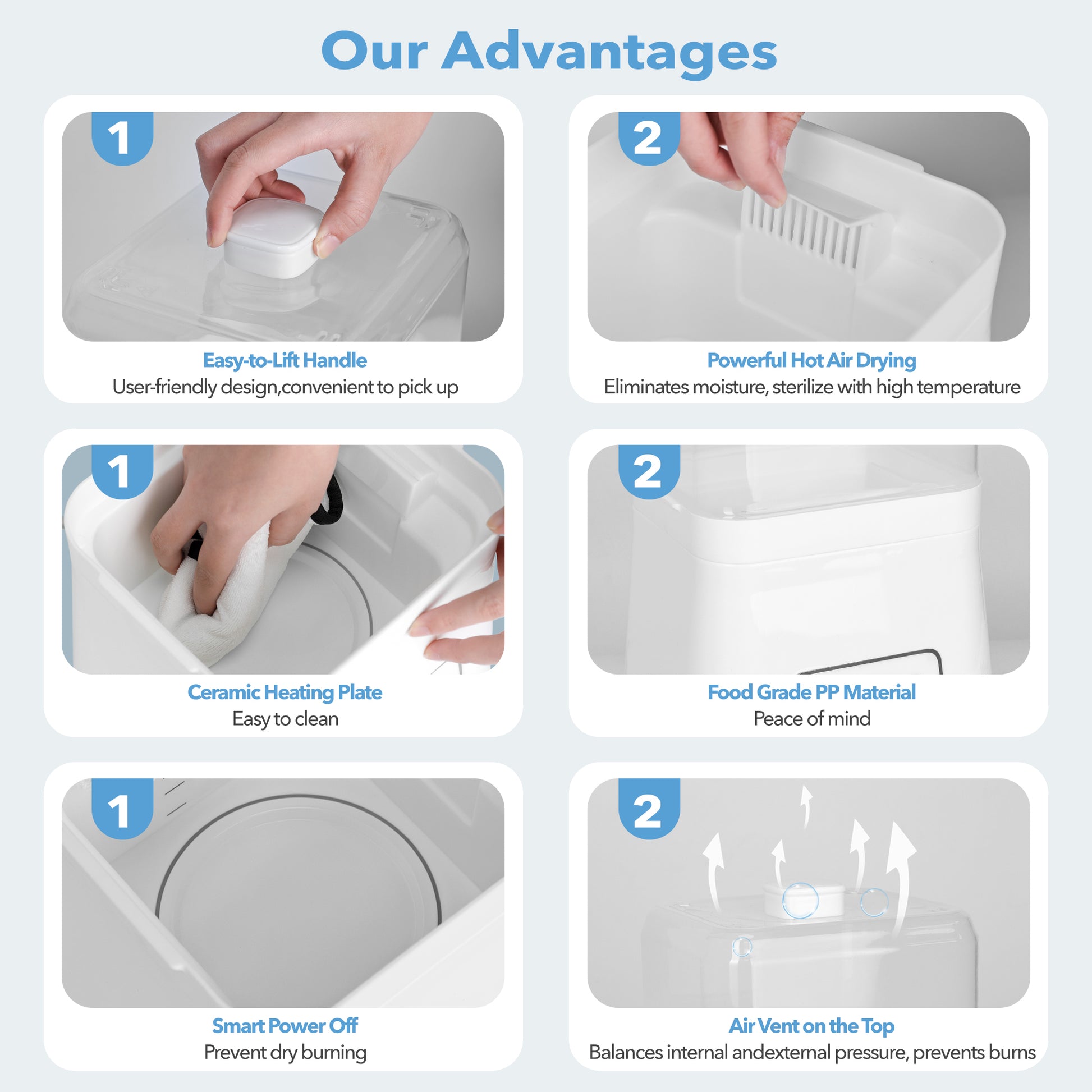Made with a durable ceramic heating plate and food-grade PP materials, this sterilizer guarantees safe use. Its sturdy construction ensures long-lasting performance while keeping your baby’s essentials free from harmful substances.