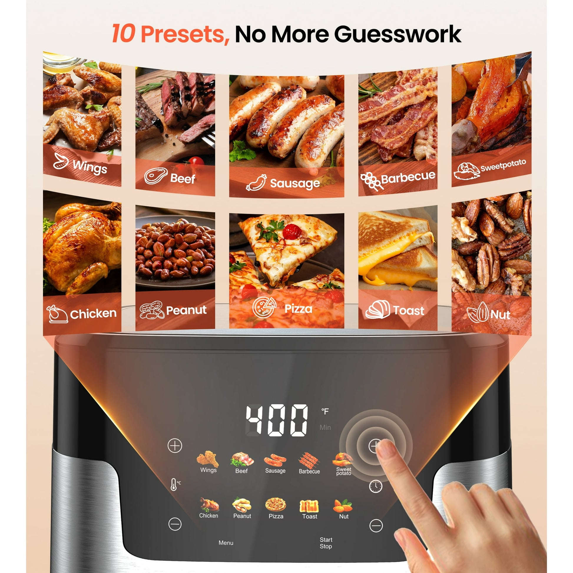 - Versatile Presets: Featuring a powerful 1350W heating system and 10 one-touch cooking presets, this air fryer lets you adjust temperatures from 175°F to 400°F and set cooking times up to 60 minutes. The auto shut-off prevents overcooking, while the cool-touch handle ensures safe operation.