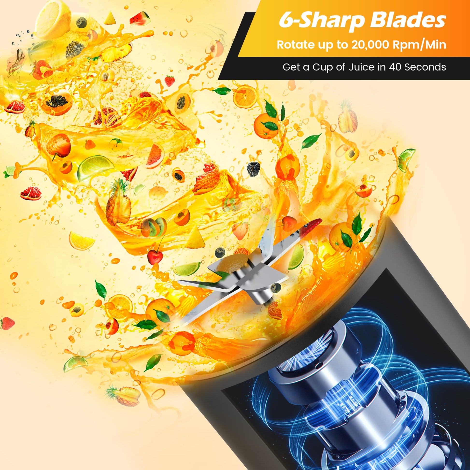 Introducing your perfect on-the-go personal travel blender for shakes and smoothies! This powerful blender features 6 blades and a 150W motor, reaching speeds up to 20,000 RPM. With a compact 16-ounce capacity, it easily fits in your bag and is USB rechargeable, providing up to 17 servings per charge thanks to its 4000mAh battery. Cleaning is a breeze with its self-cleaning function that just needs a bit of water, and the smart magnetic lock ensures safe use. Elevate your blending experience with a blender designed for performance and convenience, so you can always enjoy fresh, nutritious drinks whenever you need them. Make your life easier and healthier today!