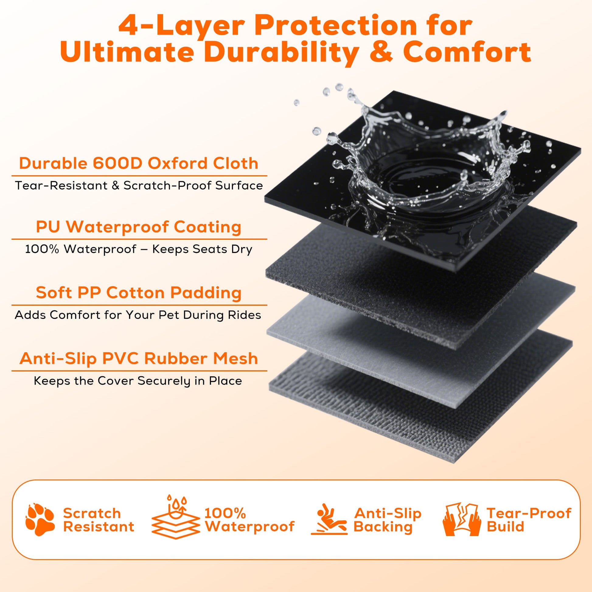 - Waterproof and Scratch-resistant:The back seat pet dog cover is made of high-quality 600D Oxford cloth and upgraded U-PVC waterproof coating, which has excellent waterproof and scratch-resistant performance. It can protect your seats from mud, liquid, hair or any mess, durable and will not scratch your leather seats