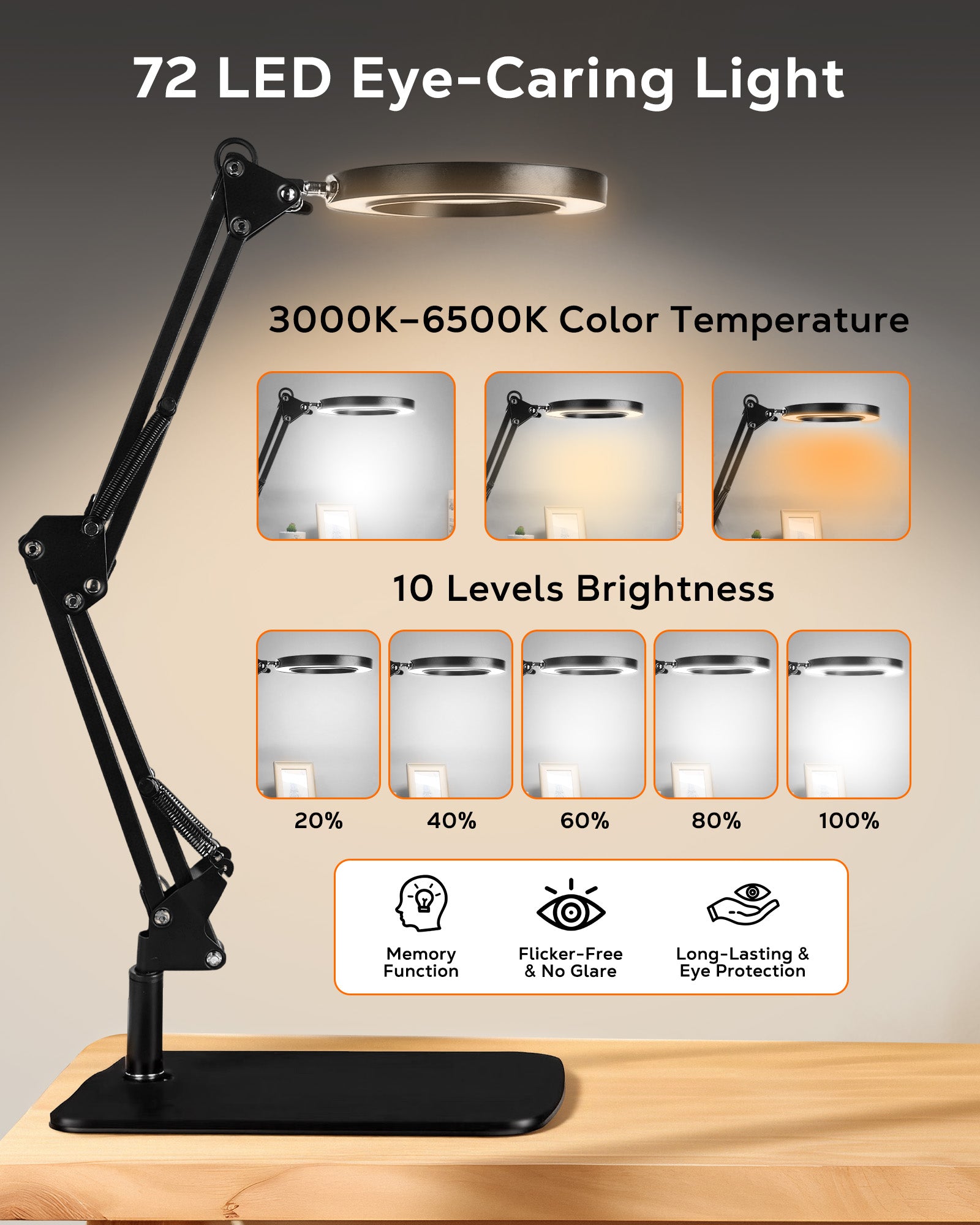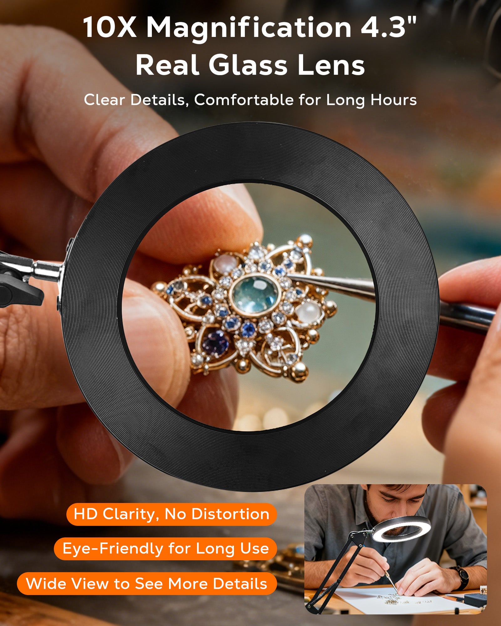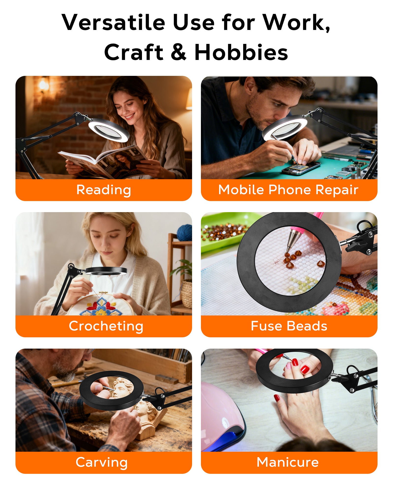 - Hands-Free Operation Unlike handheld magnifiers, this desk lamp frees both hands for precision work. Perfect for reading, repairing electronics, crafting, nail beauty, embroidery, watch repair, dental work, or micro-carving.