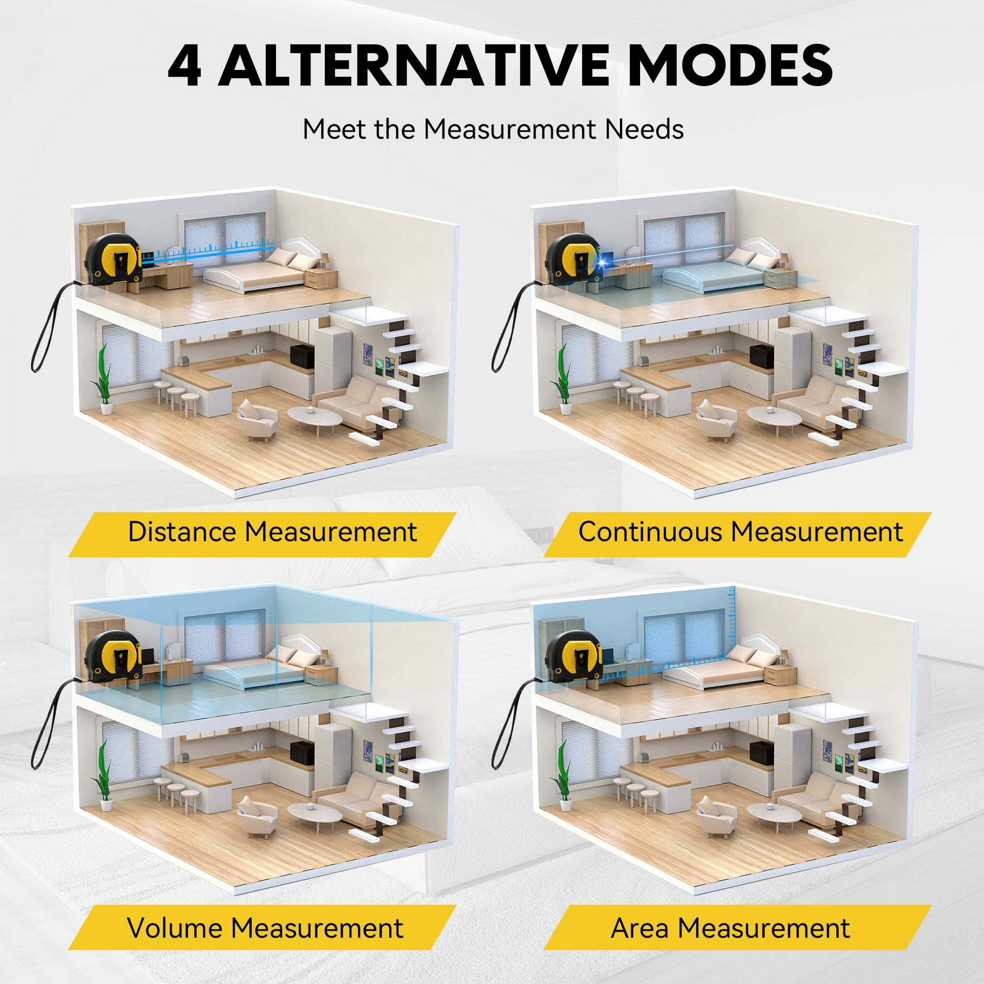 - 2-in-1 Functionality:Combines a 196ft laser distance meter and a 16ft tape measure, supporting various measurement scenarios. Ideal for home, construction, and industrial use, especially in large spaces such as rooms, buildings, factories, and warehouses. The flexible measurement modes allow simple and efficient operation tailored to your needs.