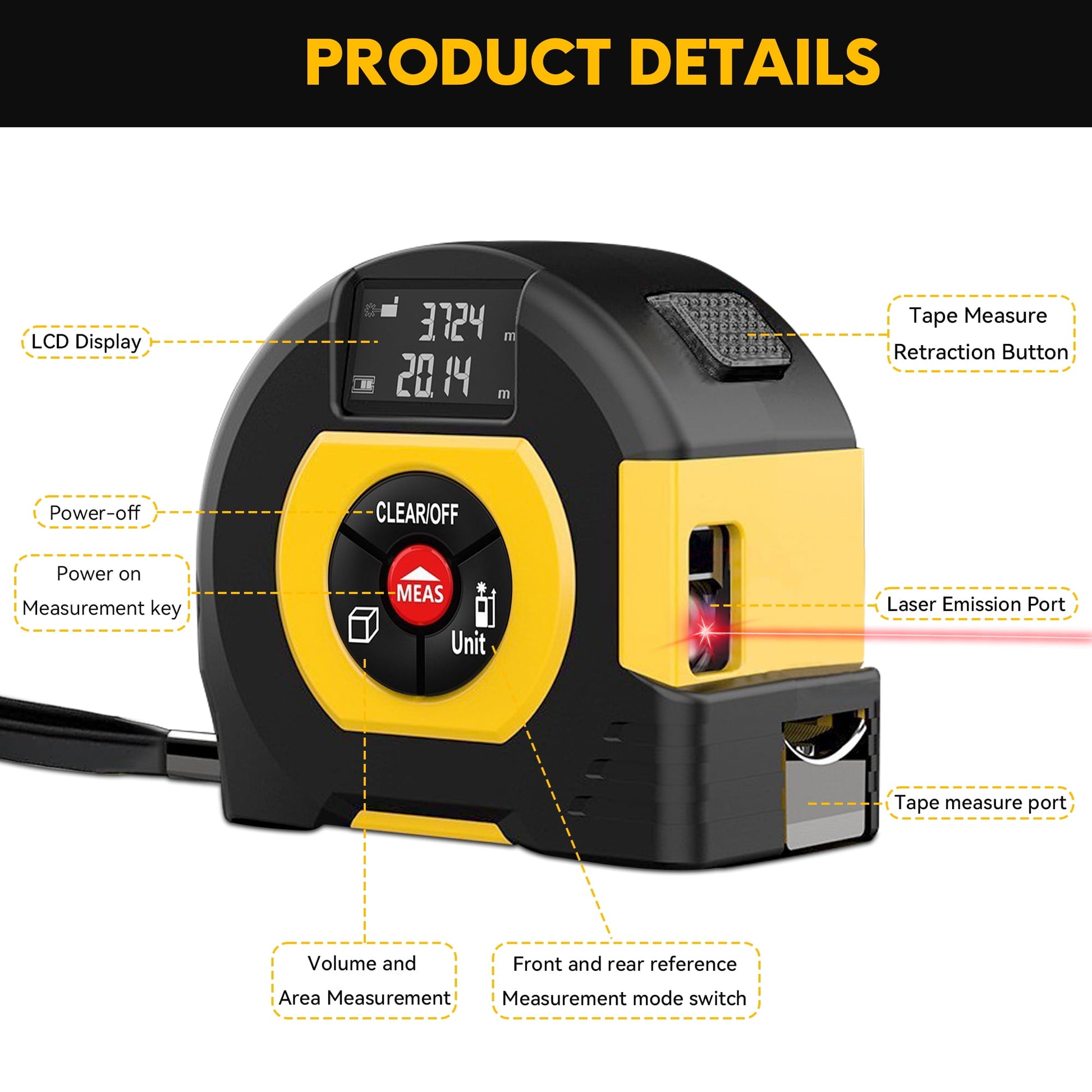 YAHHU 2-in-1 Laser Tape Measure, 196 ft/60m, Metric & US Units, LCD Display